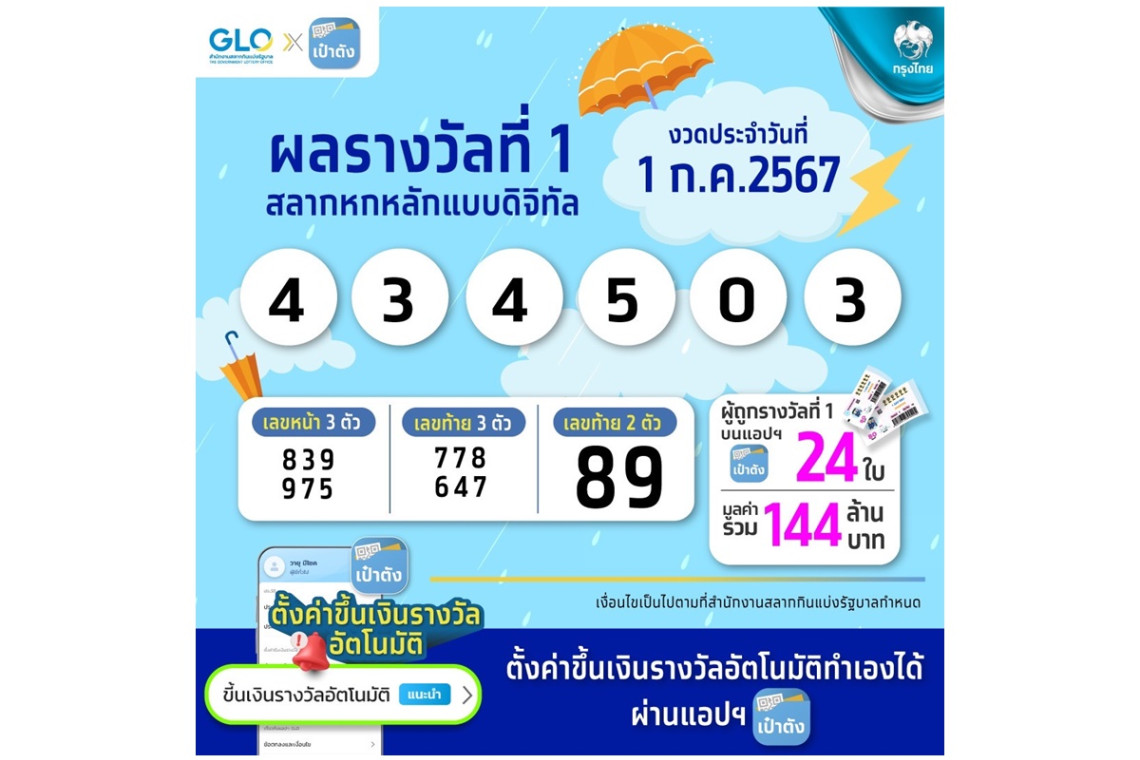 สลากดิจิทัล บนแอปฯเป๋าตัง ของธนาคารกรุงไทยงวดประจำวันที่ 01 ก.ค. 67