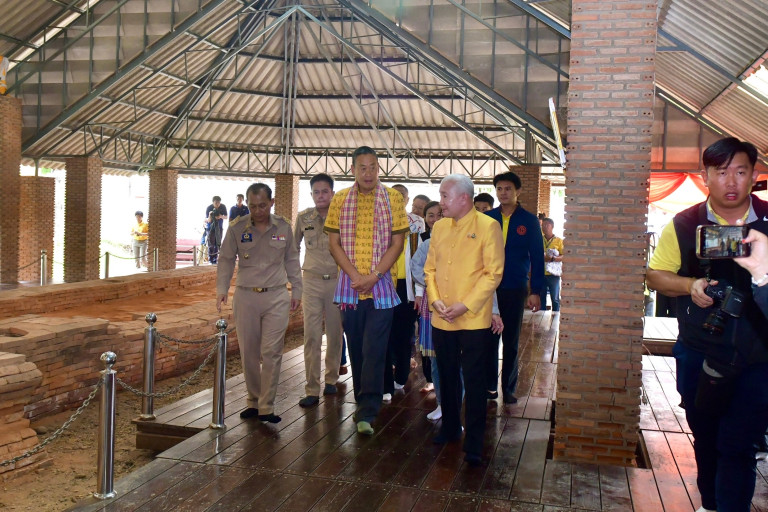 โดยเมื่อนายกฯ เดินทางถึง ได้พบปะทักทายประชาชนที่มาต้อนรับ รวมทั้งได้มอบผ้าขาวม้าเป็นที่ระลึก จากนั้นนายกรัฐมนตรี รับฟังบรรยายสรุป โครงการอนุรักษ์และพัฒนาโบราณสถานพระนอนวัดธรรมจักรเสมารามจากนายพนมบุตร จันทรโชติ อธิบดีกรมศิลปากร ที่รายงานว่าสาเหตุที่ต้องมีการบูรณะพระนอนเนื่องจากว่า พระนอนทำมาจากหินทรายแล้วถูกน้ำท่วม มีความชื้น ทำให้ผุพัง อีกทั้งพระนอนองค์นี้เป็นพระนอนที่เก่าแก่ที่สุดในประเทศไทย โดยจะใช้เวลาในการบูรณะประมาณ 240 วัน