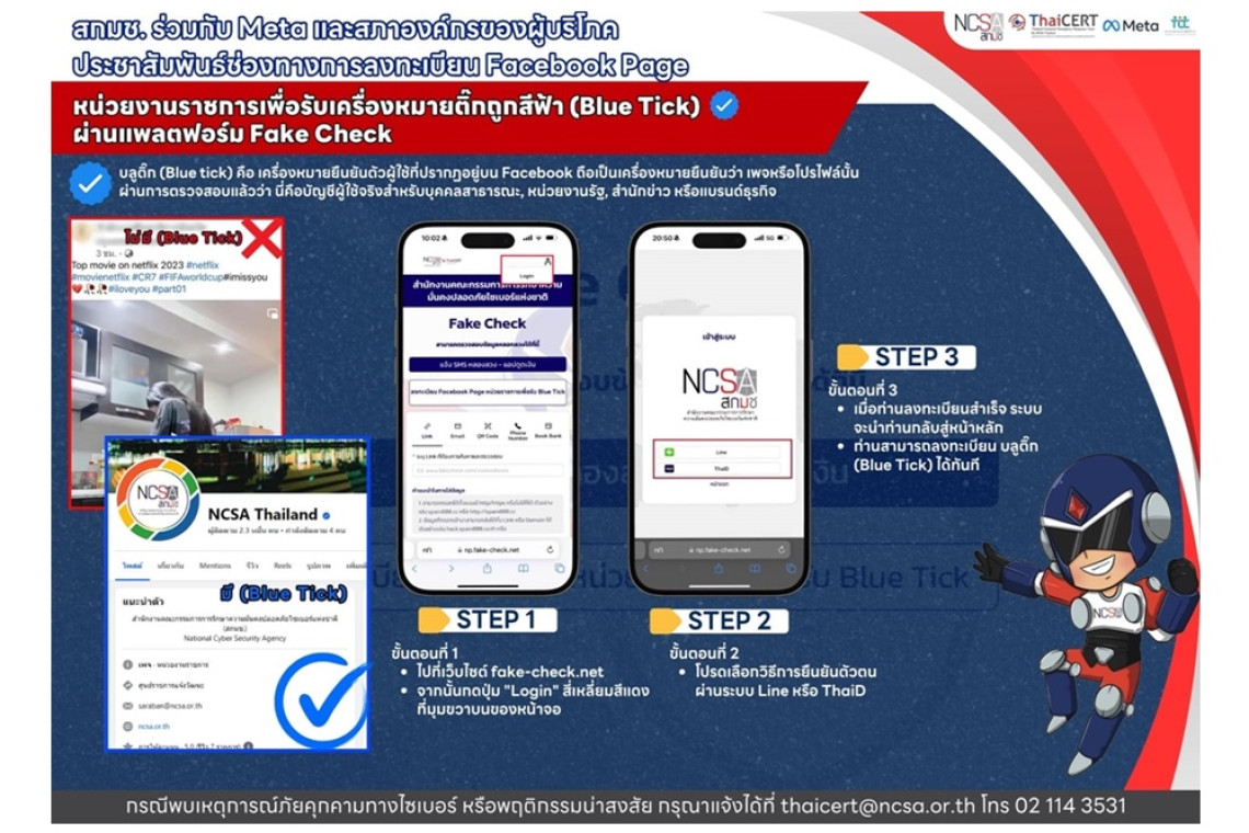 วันที่ 1 ก.ค.67 สำนักงานคณะกรรมการการรักษาความมั่นคงปลอดภัยไซเบอร์แห่งชาติ (สกมช.) ร่วมกับ Meta ผู้ให้บริการ Facebook และ สภาองค์กรของผู้บริโภค ขอเชิญหน่วยงานราชการและหน่วยงานของรัฐ ที่มี Facebook Page ลงทะเบียนรับเครื่องหมายติ๊กถูกสีฟ้า (Blue Tick) สัญลักษณ์รับรองการมีตัวตน เพื่อให้ผู้ติดตาม หรือผู้ใช้งาน Facebook ได้ติดตามบัญชีจริงเท่านั้น โดยไม่มีค่าบริการ ผ่านแพลตฟอร์ม Fake-Check ของ สกมช. ซึ่งจะช่วยระบุบัญชีปลอม รวมถึงบัญชีที่พยายามแอบอ้าง เสริมสร้างความปลอดภัย และความน่าเชื่อถือให้กับหน่วยงานของท่าน ทำให้ผู้ใช้งานสามารถแยกแยะเพจที่เป็นทางการกับเพจปลอมได้ง่าย ลดการกระทำผิด ลดปัญหาเพจปลอมได้อย่างมีประสิทธิภาพ