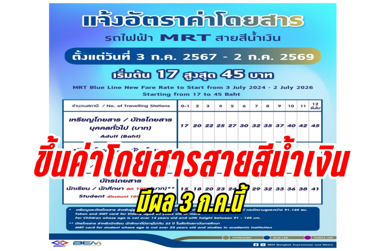 บริษัท ทางด่วนและรถไฟฟ้ากรุงเทพ จำกัด (มหาชน) หรือ BEM  แจ้งอัตราค่าโดยสารรถไฟฟ้าสายสีน้ำเงิน (สายเฉลิมรัชมงคล) ใหม่ มีผลตั้งแต่วันที่ 3 กรกฎาคม 2567 – 2 กรกฎาคม 2569 ซึ่งเป็นไปตามสัญญาสัมปทานที่กำหนดให้ปรับอัตราค่าโดยสารทุกระยะเวลา 24 เดือน หรือทุก 2 ปี ภายใต้พื้นฐานของการเปลี่ยนแปลงตามความเป็นจริงของดัชนีราคาผู้บริโภค