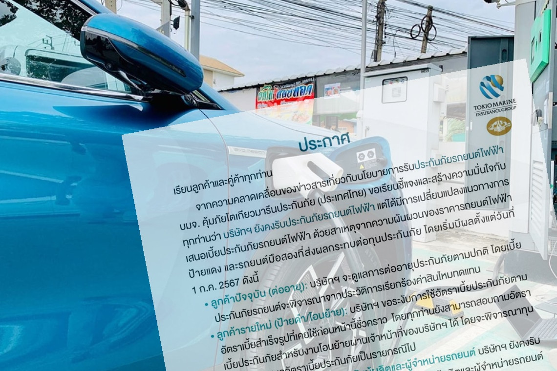 คำชี้แจง: นโยบายประกันภัยรถยนต์ไฟฟ้า บมจ. คุ้มภัยโตเกียวมารีนประกันภัย (ประเทศไทย) ขอชี้แจงว่า เรายังคงให้บริการประกันภัยรถยนต์ไฟฟ้าอย่างต่อเนื่อง แต่มีการปรับเปลี่ยนแนวทางการเสนอเบี้ยประกัน เนื่องจากความผันผวนของราคารถยนต์ไฟฟ้า โดยมีผลตั้งแต่ 1 ก.ค. 2567