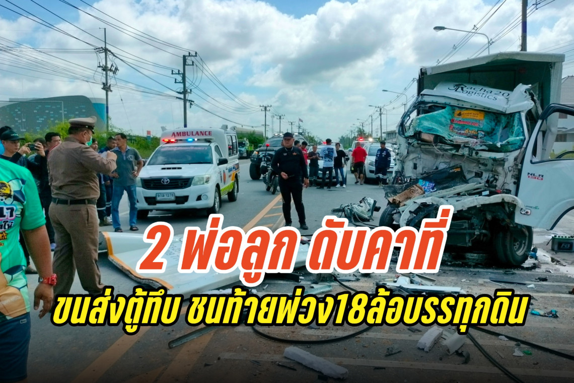 ขนส่งตู้ทึบ 4 ล้อรับจ้าง พุ่งชนท้ายพ่วงสิบแปดล้อบรรทุกดินขณะจอดรอเลี้ยวเข้าซอยหน้าวัดคู้เกษมสโมสรเมืองแปดริ้ว อัดก็อปปี้อย่างจังจนตัวรถสะท้อนกลับ กระดอนถอยออกห่างไปไกลนับสิบเมตร ทำสองพ่อลูกนั่งมาด้วยกันดับคู่