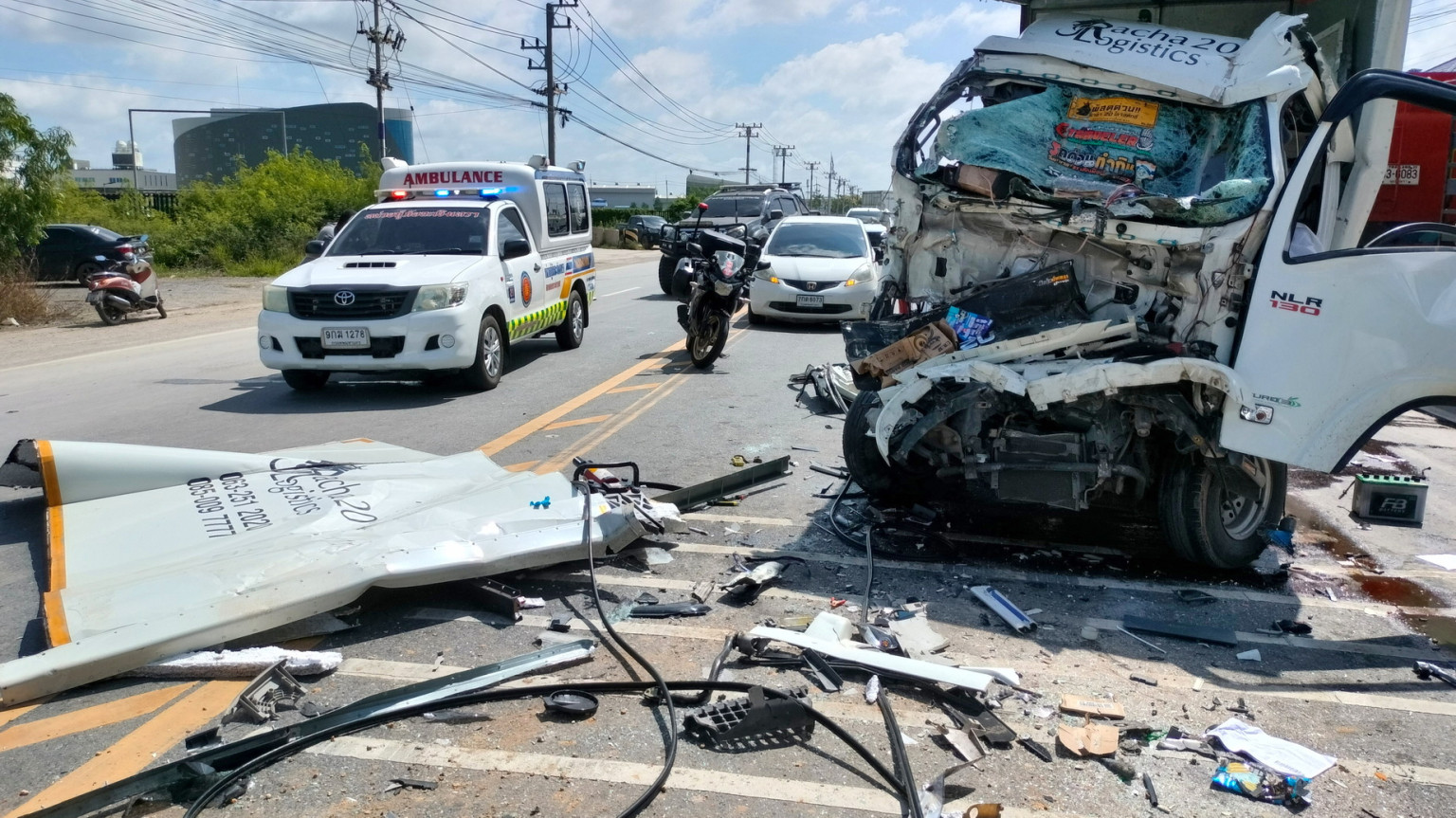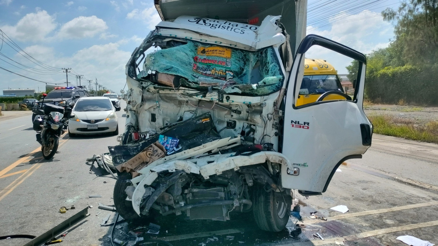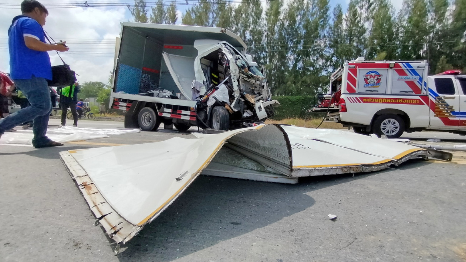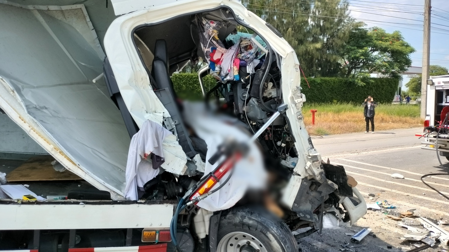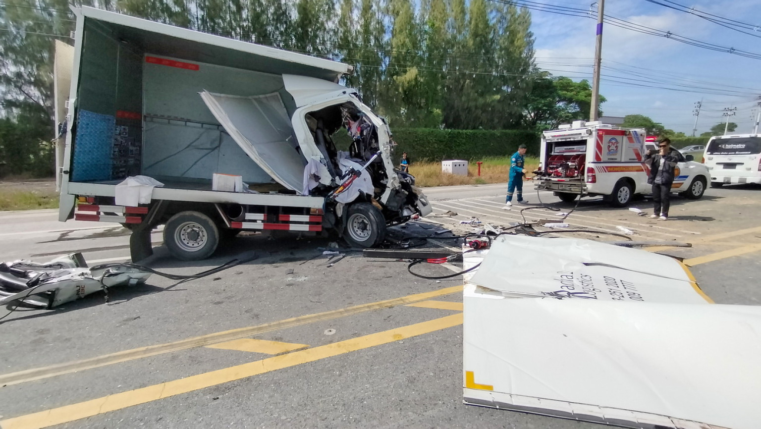 ส่วนหัวลาก เป็นรถยนต์บรรทุกสิบล้อยี่ห้ออีซูซุ หัวสีขาวหมายเลขทะเบียน 83-xxxx ฉะเชิงเทรา ถูกขับเคลื่อนย้ายเข้าไปจอดแอบไว้ยังภายในซอยทางเข้าวัด ห่างประมาณ 80 เมตร ถัดจากท้ายหางพ่วงย้อนมาทางด้านหลังประมาณกว่า 10 เมตรพบซากรถบรรทุก 4 ล้อแบบตู้ทึบยี่ห้ออีซูซุ สีขาว ทะเบียน 3ฒฐ-xxxx กทม. สภาพด้านหน้ายุบตัวแหลกลึกเข้าไปยังด้านในจนเกือบถึงส่วนของกระบะทึบด้านท้าย ส่วนตัวตู้ทางด้านขวาถูกแรงจากการพุ่งชนฉีกหลุดออกมาจากตัวรถทั้งแถบ