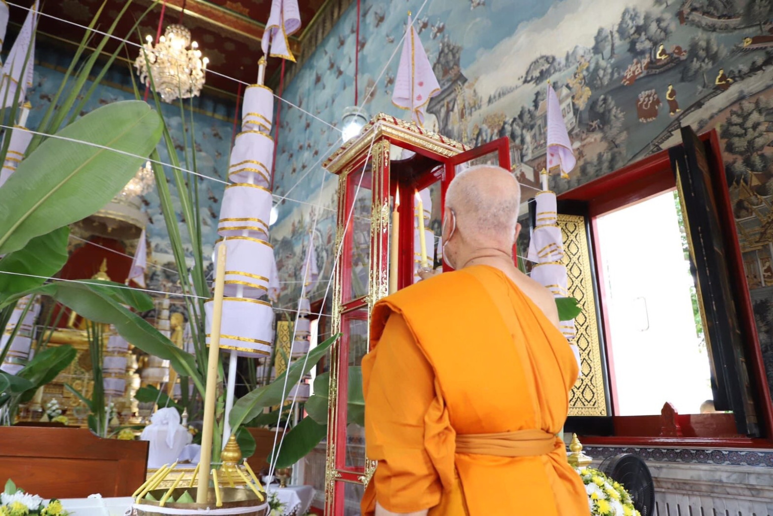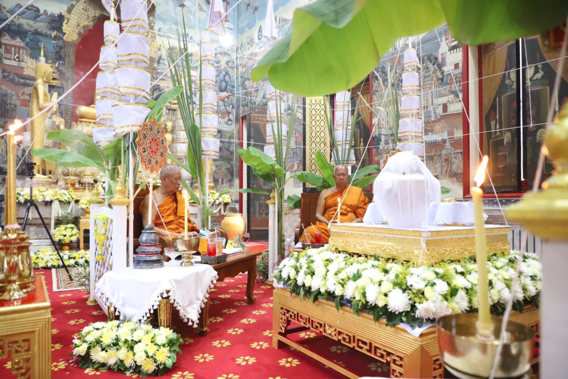 เมื่อถึงฤกษ์เวลา 17.09 น. เริ่มประกอบพิธีเสกน้ำพระพุทธมนต์ศักดิ์สิทธิ์ ประธานสงฆ์จุดเทียนชัย และเทียนพุทธาภิเษก เจ้าหน้าที่อาราธนาพระปริตร พระสงฆ์ 10 รูป เจริญพระพุทธมนต์  ผู้ว่าราชการจังหวัดอ่างทอง จุดเทียนมหามงคล เทียนทำน้ำมนต์ และเทียนนวหรคุณ จุดเทียนทอง เทียนเงิน และธูปเทียนหน้าเตียง พระสวดภาณวาร เจ้าหน้าที่อาราธนาพระสงฆ์สวตภาณวาร พระสงฆ์เถราจารย์ และพระสงฆ์สวดภาณวาร เจริญจิตภาวนาอธิษฐานจิต และสวดภาณวาร เป็นอันเสร็จสิ้นพิธี