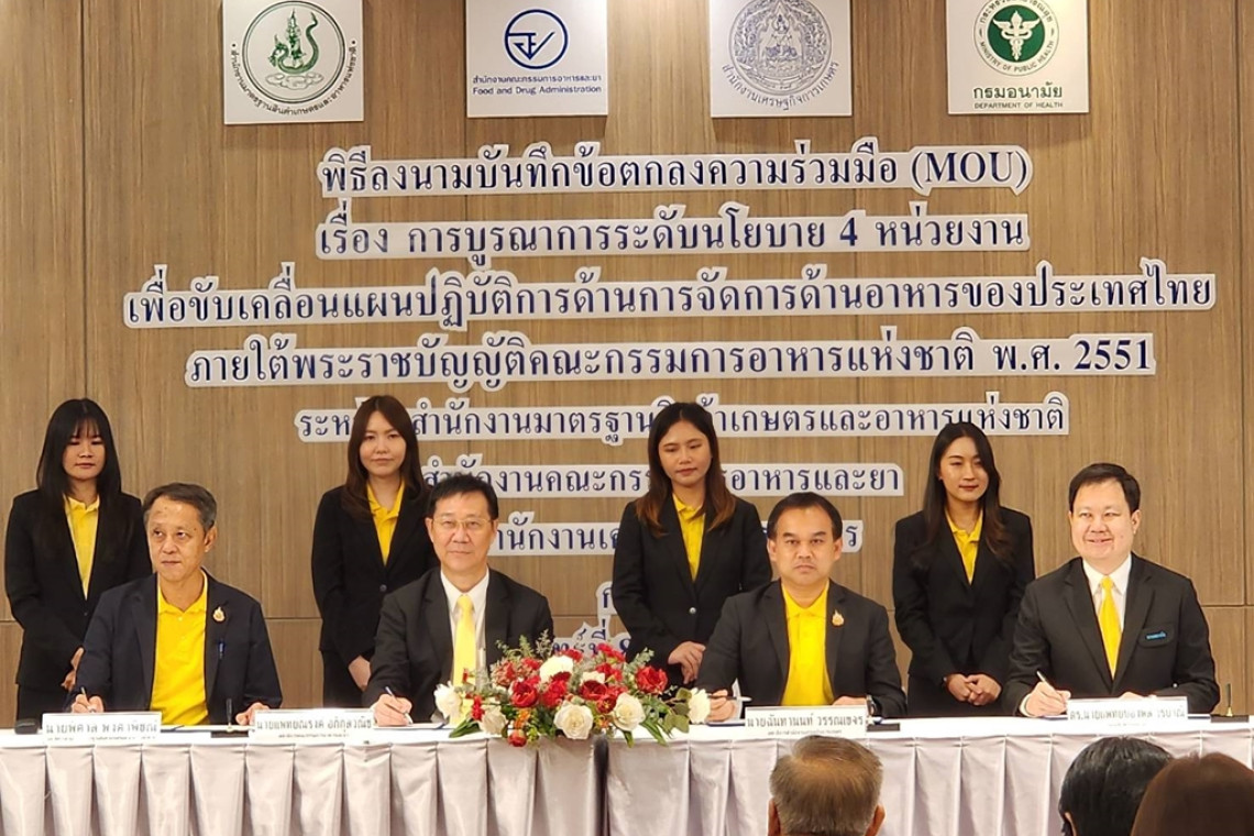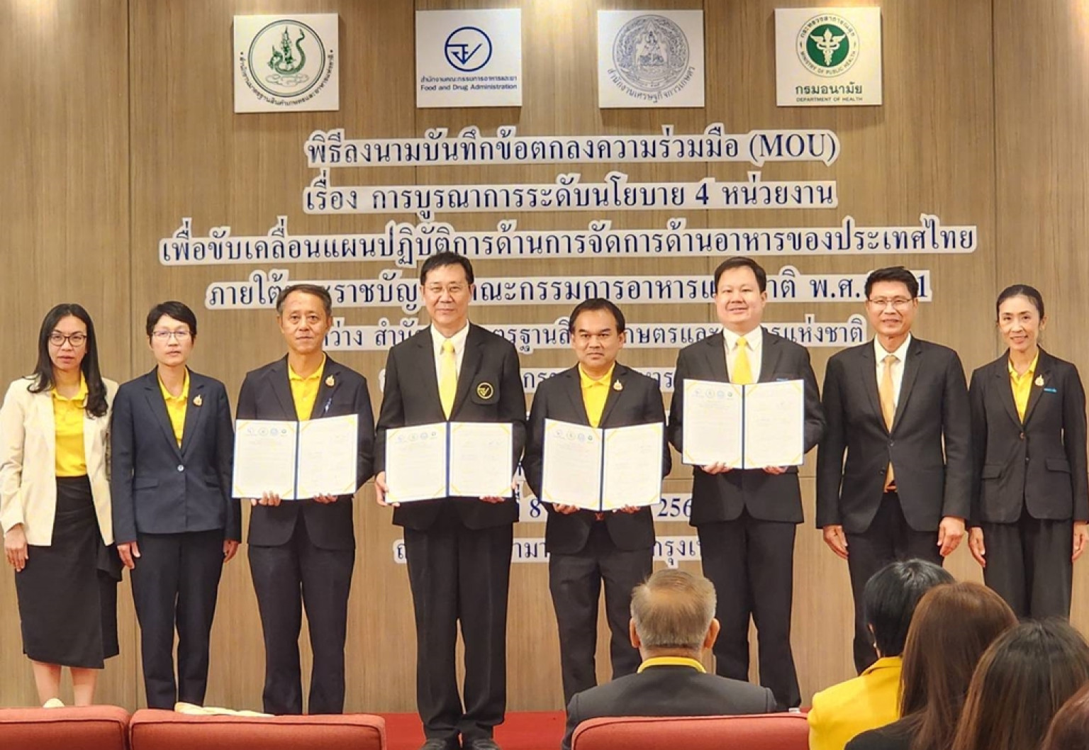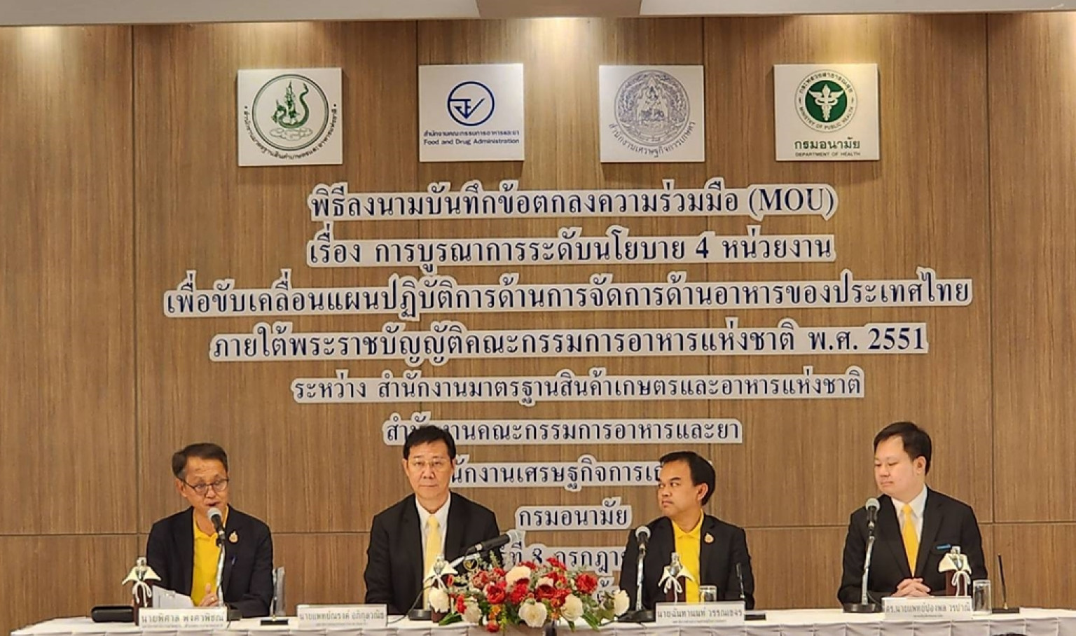 วันที่ 8 ก.ค.67 นายพิศาล พงศาพิชณ์ เลขาธิการ สำนักงานมาตรฐานสินค้าเกษตรและอาหารแห่งชาติ (มกอช.) พร้อมด้วยนายแพทย์ณรงค์ อภิกุลวณิช เลขาธิการสำนักงานคณะกรรมการอาหารและยา (อย.) นายฉันทานนท์ วรรณเขจร เลขาธิการ สศก. และ แพทย์หญิง อัจฉรา นิธิอภิญญาสกุล อธิบดีกรมอนามัย ร่วมลงนามในบันทึกข้อตกลงความร่วมมือ (MOU) การบูรณาการระดับนโยบาย เพื่อขับเคลื่อนแผนปฏิบัติการด้านการจัดการด้านอาหารของประเทศไทย ภายใต้พระราชบัญญัติคณะกรรมการอาหารแห่งชาติ พ.ศ. 2551 ระหว่างกัน