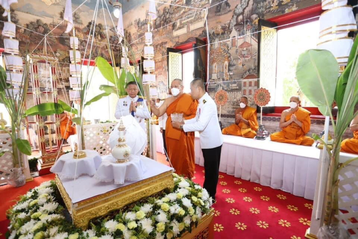 ในการนี้ ผู้ว่าราชการจังหวัดอ่างทอง ประธานในพิธีจุดธูปเทียนบูชาพระรัตนตรัย เชิญใบพลู 7 ใบ ถวายประธานสงฆ์เจิมใบพลู ประธานสงฆ์ ถวายใบพลู 7 ใบ แด่พระสงฆ์เถราจารย์ พระสงฆ์ 10 รูป เจริญพระพุทธมนต์คาถาดับเทียนชัย เจ้าหน้าที่ประโคมฆ้องชัย ดุริยางค์บรรเลงเพลงมหาฤกษ์ ประธานสงฆ์ พรมน้ำพระพุทธมนต์ที่ขันสาคร มอบขันสาครให้ผู้ว่าราชการจังหวัดอ่างทอง ประธานในพิธี กล่าวคาถาตักน้ำ และตักน้ำพระพุทธมนต์ศักดิ์สิทธิ์จากขันสาครใส่คนโท จากนั้น ผู้ว่าราชการจังหวัดอ่างทอง พร้อมด้วยผู้บริหารระดับสูงประเคนภัตตาหาร ถวายจตุปัจจัยแด่พระสงฆ์ ผู้ว่าราชการจังหวัดอ่างทอง กรวดน้ำ-รับพร