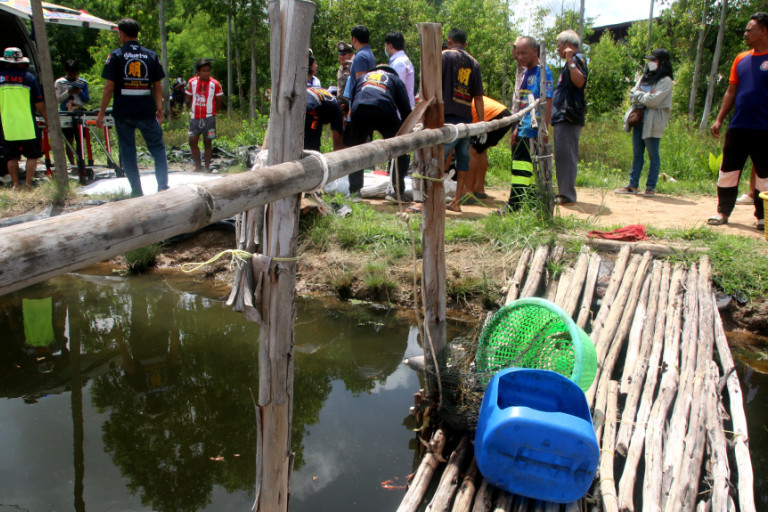 ที่เกิดเหตุ พบเป็นนากุ้งเก่า ปัจจุบันเปลี่ยนมาเป็นบ่อเลี้ยงปลากระพง โดยภายในบ่อปลา พบร่างผู้เสียชีวิต 1 ราย อยู่ในลักษณะลอยน้ำอยู่ใกล้กับสะพานไม้ไผ่ ที่ยื่นออกไปกลางบ่อสำหรับให้อาหารปลา โดยที่ปลายสะพานพบมีคันเบ็ดไม้ไผ่ตกพาดอยู่ ขณะที่ข้างสะพานพบมีกระชังใส่ปลา ที่ด้านในยังมีปลากระพงถูกขังไว้ 1 ตัว ทางตำรวจจึงได้ถ่ายภาพบันทึกไว้เป็นหลักฐาน
