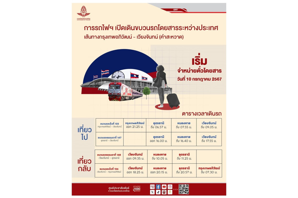 นายเอกรัช ศรีอาระยันพงษ์ หัวหน้าสำนักงานผู้ว่าการ การรถไฟแห่งประเทศไทย (รฟท.) เปิดเผยว่า ตามที่นายสุรพงษ์ ปิยะโชติ รมช.คมนาคม มีนโยบายให้การรถไฟแห่งประเทศไทย บูรณาการความร่วมมือกับรัฐวิสาหกิจรถไฟแห่งชาติลาว เพื่อขยายการให้บริการขบวนรถโดยสารระหว่างประเทศ เส้นทางสถานีกลางกรุงเทพอภิวัฒน์ - เวียงจันทน์ (คำสะหวาด) - สถานีกลางกรุงเทพอภิวัฒน์ เพื่ออำนวยความสะดวกในการเชื่อมต่อการเดินทางของประชาชน และขนส่งสินค้าระหว่างกัน ล่าสุด การรถไฟฯ มีความพร้อมแล้วในการเปิดเดินขบวนรถโดยสาร ขบวนแรก ในวันที่ 19 กรกฎาคมนี้ พร้อมกับเปิดให้ผู้โดยสาร จองตั๋วโดยสารได้ตั้งแต่บัดนี้เป็นต้นไป ซึ่งเปิดให้บริการไป-กลับ จำนวน 2 ขบวน ประกอบด้วย รถธรรมดา ชั้น 3 (พัดลม) 152 ที่ รถนั่งปรับอากาศ ชั้น 2 จำนวน 64 ที่นั่ง และรถนั่งและนอนปรับอากาศ ชั้น 2 จำนวน 30 ที่นั่ง พ่วงไปกับขบวนรถเร็วที่ 133 นอกจากนี้ ยังได้เปิดให้บริการเส้นทางอุดรธานี - เวียงจันทน์(คำสะหวาด) - อุดรธานี ไป-กลับ อีก 2 ขบวน รวมเป็น 4 ขบวน/วัน