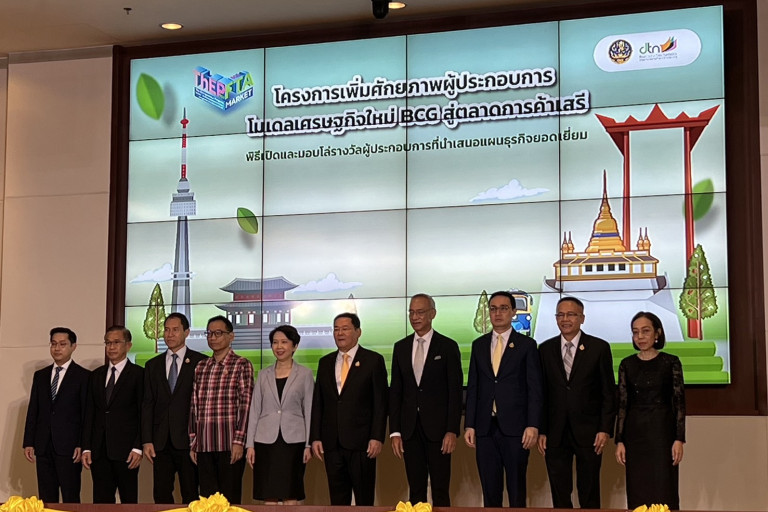 "นภินทร" เปิดโครงการ “เพิ่มศักยภาพผู้ประกอบการโมเดลเศรษฐกิจใหม่ BCG สู่ตลาดการค้าเสรี” ปี 3 พร้อมมอบโล่รางวัลผู้ประกอบการที่นำเสนอแผนธุรกิจยอดเยี่ยม 10 ราย เตรียมนำผู้ประกอบการบุกเกาหลีใต้ สำรวจตลาดไฮเปอร์มาร์เก็ต เจาะเทรนด์การบริโภคสินค้ารักษ์โลก BCG ปลายเดือนกรกฎาคมนี้