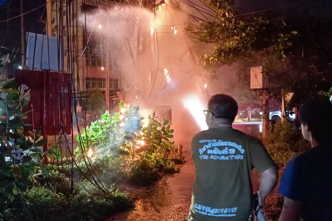 ด้านเจ้าหน้าที่อาสาสมัครมูลนิธิร่วมกตัญญู ตนได้รับแจ้งเหตุเพลิงไหม้สาย ตนจึงมาตรวจสอบ พบว่าเป็นไหม้สายไฟที่หมู่บ้านรินทร์ทองและทางเข้าถนนเสมาฟ้าคราม 2 จุด ไฟได้ไหม้เยอะ ตนได้ใช้เครื่องดับเพลิงเบื้องต้นก่อน เพื่อรอรถดับเพลิงของเทศบาลมาช่วยดับไฟได้ไหม้มาครึ่งชั่วโมงแล้ว ได้ปิดการจราจรทางเข้าถนนเสมาฟ้าครามเพื่อนำเครื่องสูบน้ำวางใช้น้ำดับไฟจึงฝากมายังพี่น้องประชาชนผู้สัญจรในช่วงเช้านี้โปรดใช้ความระมัดระวังเนื่องจากยังมีสายสื่อสารสายเคเบิ้ลต่างๆที่ถูกไฟไหม้แล้วห้อยลงมากลางถนนอาจจะเป็นอันตรายกับผู้สัญจรถนนก็ได้สวนทางการไฟฟ้านั้นเข้าตรวจสอบที่เกิดเหตุแล้วอยู่ระหว่างดำเนินการตรวจสอบว่ากระทบกับสายไฟฟ้าหลักหรือไม่หรือมีสายไฟใดขาดหล่นลงมากลางถนนหรือไม่เพื่อจะดำเนินการแก้ไขต่อไป