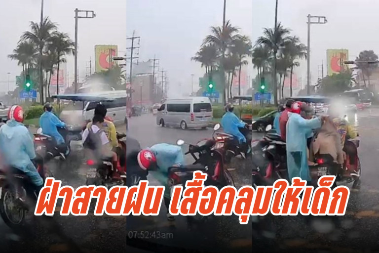 แห่ชื่นชมหญิงฝ่าสายฝน นำเสื้อไปคลุมหัวเด็กน้อยที่กำลังจะไปโรงเรียน สร้างความประทับใจในช่วงวันฝนตกหนักของเมืองพัทยา
