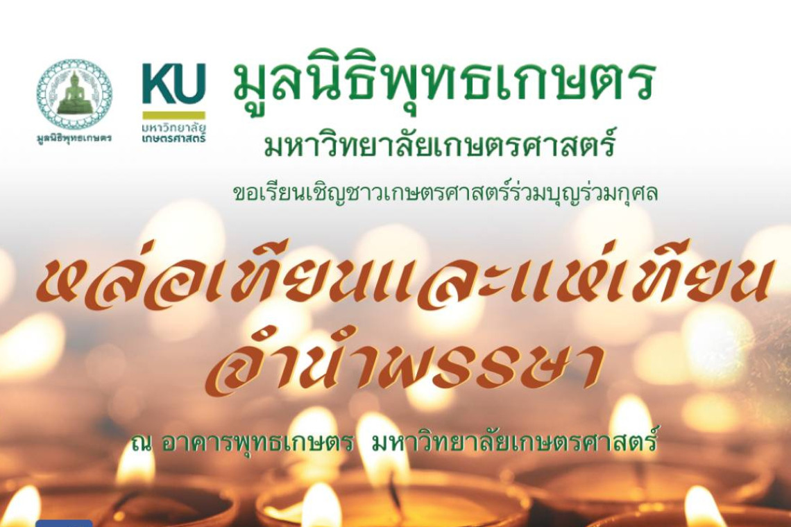มูลนิธิพุทธเกษตร มหาวิทยาลัยเกษตรศาสตร์ ขอเรียนเชิญประชาชนและชาวเกษตรศาสตร์ร่วมบุญร่วมกุศลหล่อเทียนและแห่เทียนจำนำพรรษาถวายพุ่มผ้าป่า สมทบทุนสร้างโรงพยาบาลมหาวิทยาลัยเกษตรศาสตร์ และร่วมกันปลูกต้นพระศรีมหาโพธิ์ระหว่างวันที่ 15-19 กรกฎาคม 2567 ณ อาคารพุทธเกษตร มหาวิทยาลัยเกษตรศาสตร์