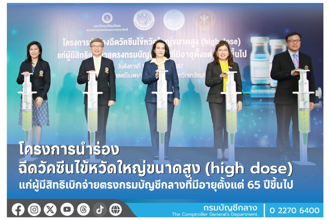 กรมบัญชีกลางเปิดโครงการนำร่อง ฉีดวัคซีนไข้หวัดใหญ่ขนาดสูง (high dose) แก่ผู้มีสิทธิเบิกจ่ายตรงที่มีอายุตั้งแต่ 65 ปีขึ้นไป