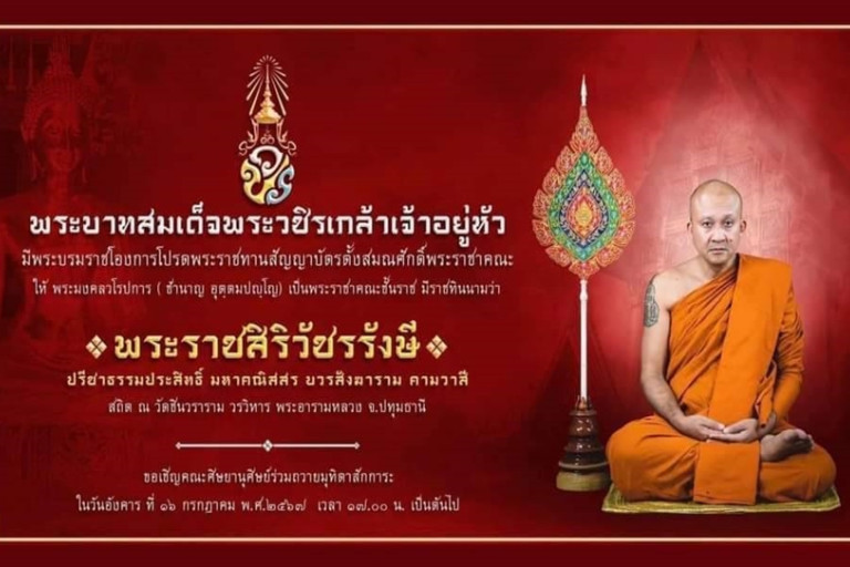 วันที่ 16 ก.ค.2567 พระบาทสมเด็จมระวชิรเกล้าเจ้าอยู่หัว มีพระบรมราชโองการโปรดพระราชทานสัญญาบัตรตั้งสมณศักดิ์พระราชาคณะ ให้ พระมชคลวโรปการ ( ชำนาญ อุตุตมปญฺโญ) เป็นพระราชาคณะชั้นราช มีราชทินนามว่า “พระราชสิริวัชรรังษี” ปรีชาธรรมประสิทธิ์ มหาคณิสสร ขวรสิงฆาราม คามวาสี สถิต ณ วัดชินวราราม วรวิหาร พระอารามหลวง ต.บางขะแยง อ.เมือง จ.ปทุมธานี