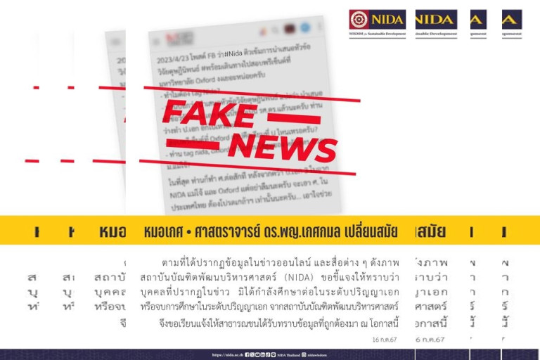 ตามที่ได้ปรากฏข้อมูลในข่าวออนไลน์ และสื่อต่าง ๆ ดังภาพ สถาบันบัณฑิตพัฒนบริหารศาสตร์ (NIDA) ขอชี้แจงให้ทราบว่า