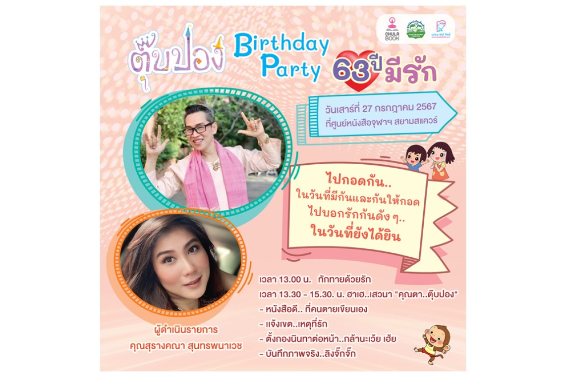 ศูนย์หนังสือจุฬาลงกรณ์มหาวิทยาลัย ร่วมกับ มูลนิธิหนังสือเพื่อเด็ก และแปลนฟอร์คิดส์ ขอเชิญชวนผู้ปกครอง และคุณหนูๆ ร่วมกิจกรรม "ตุ๊บปอง Birthday Party 63 ปี มีรัก" พบกับ คุณเรืองศักดิ์ ปิ่นประทีป (คุณตาตุ๊บปอง) กรรมการผู้จัดการมูลนิธิหนังสือเพื่อเด็ก นักเขียนนิทาน ชวนเด็กๆ ร้อง เล่น ฮาเฮ กับหนังสือนิทานของคุณตาตุ๊บปอง ดำเนินรายการโดย คุณสุรางคณา สุนทรพนาเวช