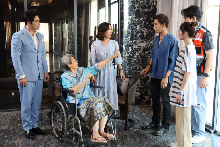 จากนั้นมาต่อกันด้านในโรงแรม เป็นฉากต่อเนื่อง ลิฟท์ บอกจะไปรักษาอาการป่วย และขอโอกาสอีกครั้ง จู่ ๆ โอ, คิมม่อน และมิ้ม ก็โผล่เข้ามา บอกความจริงกับ เนสท์ ว่า อาโย แกล้งป่วยเพื่ออยากให้ ยาใจ แต่งงาน ก็ทำเอาหลานน้อยใจที่โดนหลอก ซึ่งเช่นเคยก่อนถ่ายผู้กำกับ ก็ให้เหล่านักแสดงซ้อม พร้อมกล้อง เพราะต้องรู้จังหวะที่ทั้งสามนักแสดงเปิดประตูเข้ามา หลังจากที่ซ้อมจนเข้าใจกัน และบทไม่ติดขัด เสียงแอ็กชั่น ก็ดังขึ้น นักแสดงทุกคนเล่นไปตามที่ซ้อม แม้ฉากนี้ต้องใช้เวลาถ่ายอยู่นานเป็นชั่วโมงความที่ต้องเปลี่ยนมุมภาพ และถ่ายเจาะเหล่านักแสดง แต่สุดท้ายก็ผ่านฉลุยไม่มีเทคความที่เป็นมืออาชีพกันเกือบทุกคน