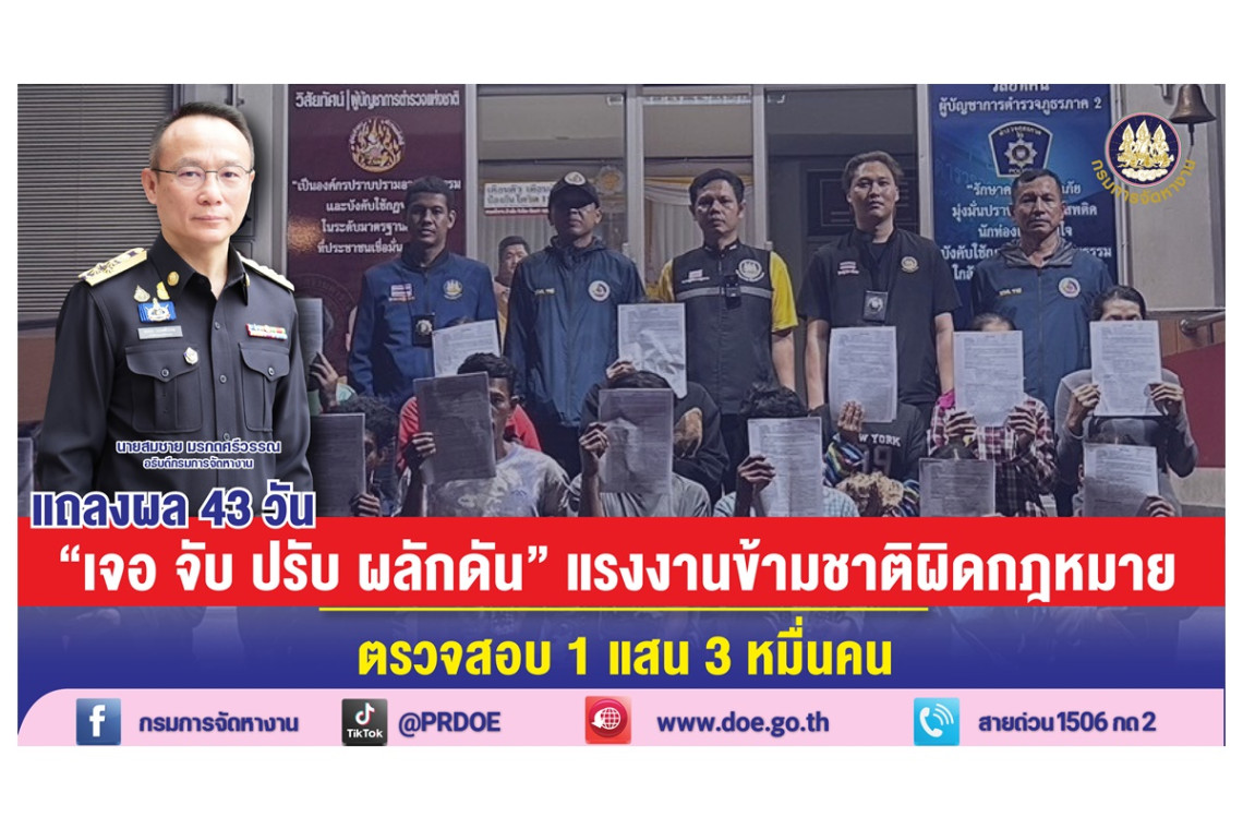 กรมการจัดหางาน เดินหน้าปฏิบัติการ “เจอ จับ ปรับ ผลักดัน” ตรวจเข้มแรงงานข้ามชาติผิดกฎหมาย แจงผลตรวจสอบคนต่างชาติกว่า 1 แสน 3 หมื่นคน ดำเนินคดี 889 คน พร้อมฝากถึงพลเมืองดีร่วมแจ้งเบาะแสกระทำผิดมาที่ “กองทะเบียนจัดหางานกลางและคุ้มครองคนหางาน”