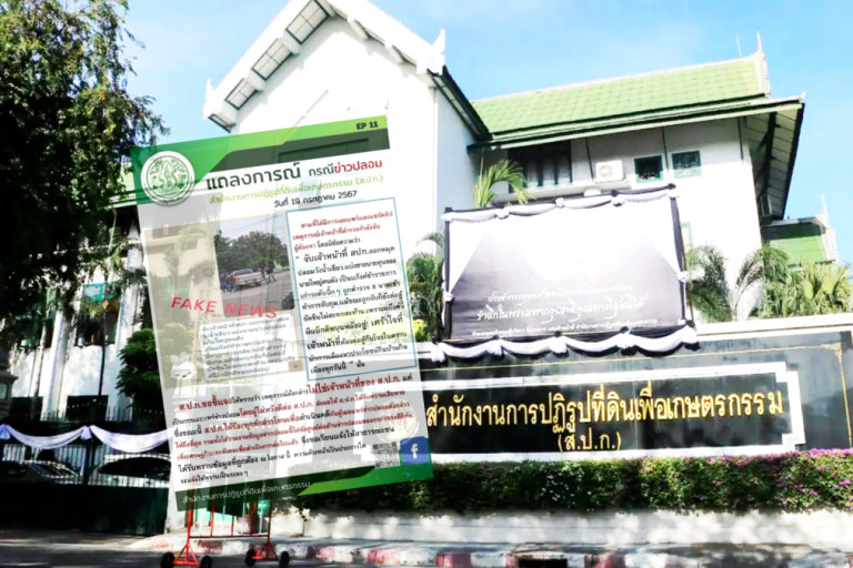 ซึ่งขณะนี้ ส.ป.ก.ได้ร้องทุกข์กล่าวโทษเพื่อดำเนินคดีกับผู้เผยแพร่ข่าวปลอมดังกล่าวให้ถึงที่สุด รวมทั้งได้รายการข้อมูลข่าวปลอมนี้ไปยังศูนย์ต่อต้านข่าวปลอมของกระทรวงดิจิทัลเพื่อเศรษฐกิจและสังคมเพื่อดำเนินการต่อไปแล้ว จึงขอเรียนแจ้งให้สาธารณะชนได้รับทราบข้อมูลที่ถูกต้อง