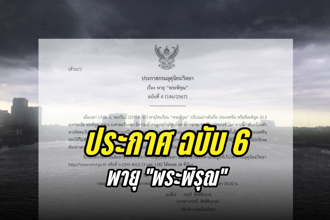 วันที่ 22 กรกฏาคม พ.ศ. 2567 นางสาวกรรวี สิทธิชีวภาค อธิบดีกรมอุตุนิยมวิทยา ออกประกาศกรมอุตุนิยมวิทยา เรื่อง พายุ “พระพิรุณ” ฉบับที่ 6 (146/2567) ความว่า เมื่อเวลา 17.00 น. ของวันนี้ (22 ก.ค. 67) พายุโซนร้อน “พระพิรุณ” บริเวณอ่าวตังเกี๋ย ประเทศจีน หรือที่ละติจูด 20.2 องศาเหนือ ลองจิจูด 108.6 องศาตะวันออก มีความเร็วลมสูงสุดใกล้ศูนย์กลางประมาณ 93 กิโลเมตรต่อชั่วโมง พายุนี้กำลังเคลื่อนตัวทางทิศตะวันตกเฉียงเหนือค่อนทางเหนือด้วยความเร็วประมาณ 15 กิโลเมตรต่อชั่วโมง คาดว่าจะเคลื่อนขึ้นฝั่งบริเวณประเทศจีนตอนใต้ในช่วงวันที่ 22–23 ก.ค. 67 พายุนี้ไม่ส่งผลกระทบโดยตรงต่อลักษณะอากาศของประเทศไทย ขอให้ผู้ที่จะเดินทางไปบริเวณดังกล่าวตรวจสอบสภาพอากาศก่อนออกเดินทางในช่วงวันดังกล่าวไว้ด้วย