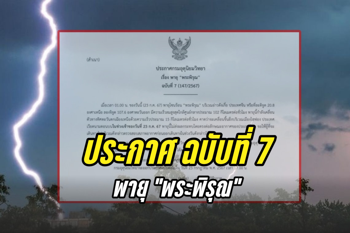 วันที่ 23 ก.ค.67 กรมอุตุนิยมวิทยา ประกาศ เรื่อง พายุ “พระพิรุณ” ฉบับที่ 7 (147/2567) ระบุว่า...