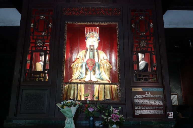 ศาลเจ้าพระเจ้าเล่าปีกับพระเจ้าเล่าเสี้ยนเจ้าไม่มีศาล ศาลเคารพพระเจ้าเล่าปี่เมื่อเดินเข้ามาถึงห้องโถงกลางของศาลเจ้า พระเล่าปี่ในเครื่องฮ่องเต้อยู่กลางด้านข้างขวามือเป็นรูปของเป่ยตี้อ๋องหรือองค์ชายเล่าขำ ผู้เป็นหลานปู่เป็นพระราชบุตรในพระเจ้าเล่าเสี้ยนแห่งจ๊กก๊ก มีพระเชษฐาร่วมพระบิดามารดาเดียวกันคือเล่ายอย เล่าเอียว เล่าจ้อง เล่าจ้าน เล่าสุนและเล่ากี่