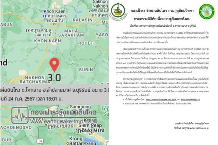 วันที่ 26 ก.ค.67  กองเฝ้าระวังแผ่นดินไหว กรมอุตุนิยมวิทยา กระทรวงดิจิทัลเพื่อเศรษฐกิจและสังคม ออกประกาศ เรื่อง ชี้แจงสถานการณ์เหตุการณ์แผ่นดินไหวที่ อ.ลำปลายมาศ จ.บุรีรัมย์ โดยมีใจความว่า