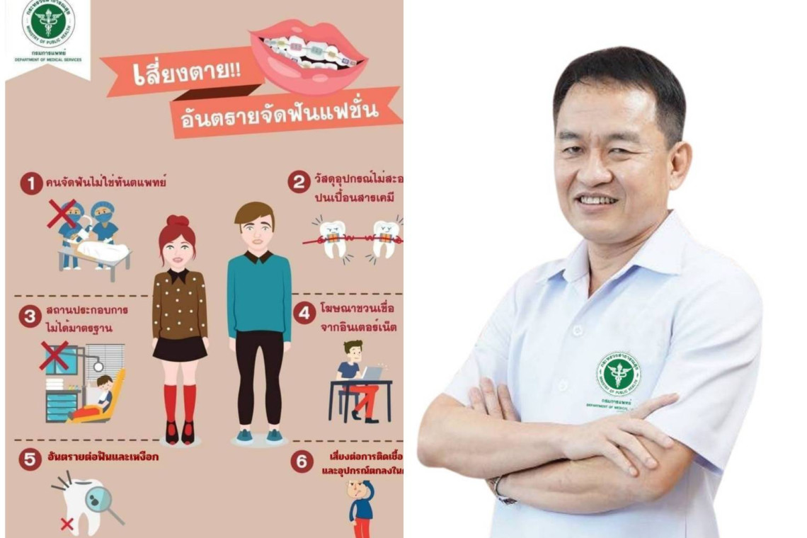 นายแพทย์ไพโรจน์ สุรัตนวนิช รองอธิบดีกรมการแพทย์ กล่าวว่า ปัจจุบันพบข่าวมีผู้ลักลอบจัดฟันแฟชั่น โดยการชักชวนให้มาจัดฟันในสื่อสังคมออนไลน์ โดยลักลอบจัดฟันในสถานที่ต่างๆ เป็นการกระทำที่อันตรายเป็นอย่างมาก ซึ่งการจัดฟันเป็นการแก้ไขปัญหาเรื่องการสบฟันผิดปกติ ฟันซ้อนเก ฟันห่าง ฟันยื่น โดยต้องมีทันตแพทย์ดูแลอย่างใกล้ชิดทุกขั้นตอน จะช่วยให้มีสุขภาพช่องปากที่ดีขึ้น เพิ่มความมั่นใจและเสริมบุคลิกภาพ แต่ในการจัดฟันแฟชั่นที่กำลังระบาดอยู่ในขณะนี้ มีรูปแบบพัฒนาไปจากเดิมมาก มีแหล่งขายรีเทนเนอร์ ขนาดใหญ่ และร้านที่ลักลอบให้บริการติดอุปกรณ์ลวดดัดฟันแฟชั่นผิดกฎหมาย เช่น ในสื่อออนไลน์ เปิดร้านเช่าเล็กๆ และมีพนักงาน 1-2 คนให้บริการ โดยมีกลุ่มเป้าหมายเป็นนักเรียน นักศึกษา คิดค่าบริการในราคาถูก ซึ่งเป็นวิธีการที่ไม่ถูกต้องและอาจทำให้เกิดอันตรายได้ ดังนั้นควรได้รับการรักษาจากทันตแพทย์ผู้เชี่ยวชาญ มีการประเมินก่อนการรักษา เพราะการจัดฟันเป็นการรักษาที่ต่อเนื่องและใช้ระยะเวลานาน เครื่องมืออุปกรณ์ที่ใช้ต้องผ่านขั้นตอนการฆ่าเชื้อ มีการบรรจุในซองอย่างดี รวมไปถึงขั้นตอนในการติดตั้งอุปกรณ์ในการจัดฟันต้องใช้น้ำยาทำความสะอาดที่ได้มาตรฐานทางการแพทย์ ทั้งนี้ จึงไม่แนะนำให้จัดฟันกับร้านจัดฟันแฟชั่นหรือร้านที่ไม่ได้มาตรฐาน แต่หากได้ทำไปแล้ว ควรต้องรีบพบทันตแพทย์ทันทีเพื่อทำการรักษาและแก้ไขโดยเร็ว