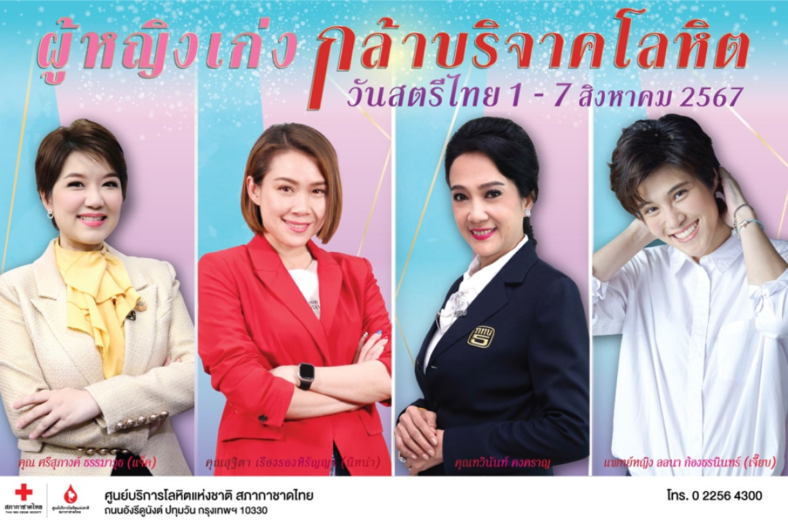 เนื่องในโอกาสวันเฉลิมพระชนมพรรษาสมเด็จพระนางเจ้าสิริกิติ์ พระบรมราชินีนาถ พระบรมราชชนนีพันปีหลวง ทรงเจริญพระชนมพรรษา 92 พรรษา 12 สิงหาคม 2567 ศูนย์บริการโลหิตแห่งชาติ สภากาชาดไทย ได้จัด โครงการผู้หญิง “เก่ง-กล้า” บริจาคโลหิต วันสตรีไทย” ระหว่างวันที่ 1-7 สิงหาคม 2567 เพื่อเชิญชวนสตรีไทยที่มีสุขภาพดี และสตรีจากหน่วยงานของภาครัฐ ภาคเอกชน ทั่วประเทศ รวมพลังบริจาคโลหิตช่วยเหลือผู้ป่วย เพื่อลดปัญหาโลหิตขาดแคลน และสำรองโลหิตคงคลังให้มีปริมาณเพียงพอสำหรับใช้ในกรณีเร่งด่วน ได้อย่างทันท่วงที บริจาคโลหิตได้ที่ศูนย์บริการโลหิตแห่งชาติ สภากาชาดไทย หน่วยรับบริจาคโลหิตประจำที่ 7 แห่ง (Fixed Station) และภาคบริการโลหิตแห่งชาติ 12 แห่งทั่วประเทศ