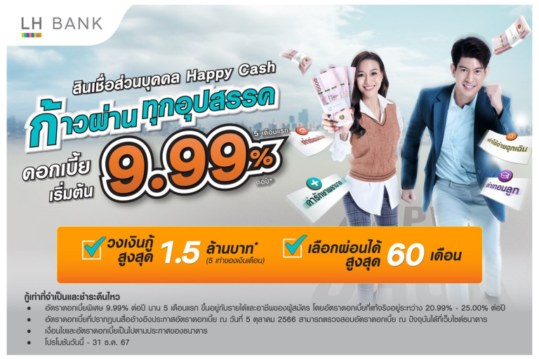 ธนาคารแลนด์ แอนด์ เฮ้าส์ จำกัด (มหาชน) หรือ LH Bank ออกแคมเปญภายใต้คอนเซ็ปต์ “ก้าวผ่านทุกอุปสรรค” ให้กับผู้สมัครขอสินเชื่อส่วนบุคคล Happy Cash เพื่อช่วยเสริมสภาพคล่องทางการเงินแก่ลูกค้า ซึ่งธนาคารให้ความสำคัญเป็นอย่างยิ่งในการให้สินเชื่อด้วยความรับผิดชอบและเป็นธรรม มุ่งหวังในการช่วยเหลือเพื่อแบ่งเบาภาระค่าใช้จ่าย ไม่ให้แบกภาระก่อหนี้จนเกินตัว รวมถึงสนับสนุนการเข้าถึงสินเชื่อส่วนบุคคลอย่างถูกต้องและมุ่งเน้นให้รู้เท่าทันมิจฉาชีพ ไม่หลงเชื่อบุคคลที่แอบอ้างหลอกให้กู้เงินออนไลน์ สินเชื่อส่วนบุคคล Happy Cash อัตราดอกเบี้ยแบบลดต้นลดดอก เริ่มต้น 9.99% ต่อปี นาน 5 เดือนแรก ขึ้นอยู่กับรายได้และอาชีพของผู้สมัคร (อัตราดอกเบี้ยที่แท้จริงอยู่ระหว่าง 20.99%-25.00% ต่อปี) วงเงินกู้สูงสุด 5 เท่าของรายได้ หรือสูงสุด 1.5 ล้านบาท ผ่อนสบายนานสูงสุด 60 เดือน
