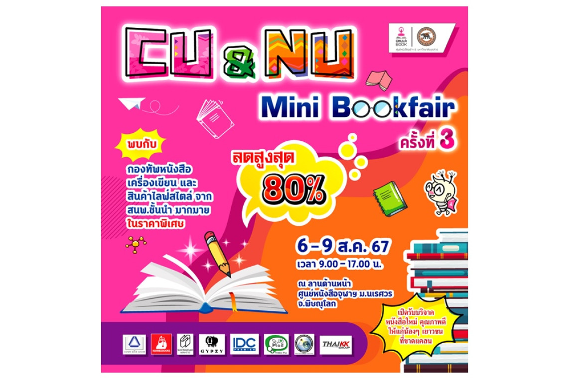 ศูนย์หนังสือจุฬาลงกรณ์มหาวิทยาลัย ร่วมกับ มหาวิทยาลัยนเรศวร  ชวนนักอ่านเลือกสรรหนังสือในงาน  “CU&NU Mini Bookfair” ครั้งที่ 3 ระหว่างวันที่ 6-9 สิงหาคม 2567 เวลา 09.00 – 17.00 น. ณ ลานด้านหน้าศูนย์หนังสือจุฬาฯ สาขามหาวิทยาลัยนเรศวร จังหวัดพิษณุโลก พบกับกองทัพหนังสือจากสำนักพิมพ์ชั้นนำ เครื่องเขียน สินค้าไลฟ์สไตล์ ในราคาพิเศษ ลดสูงสุด 80 %