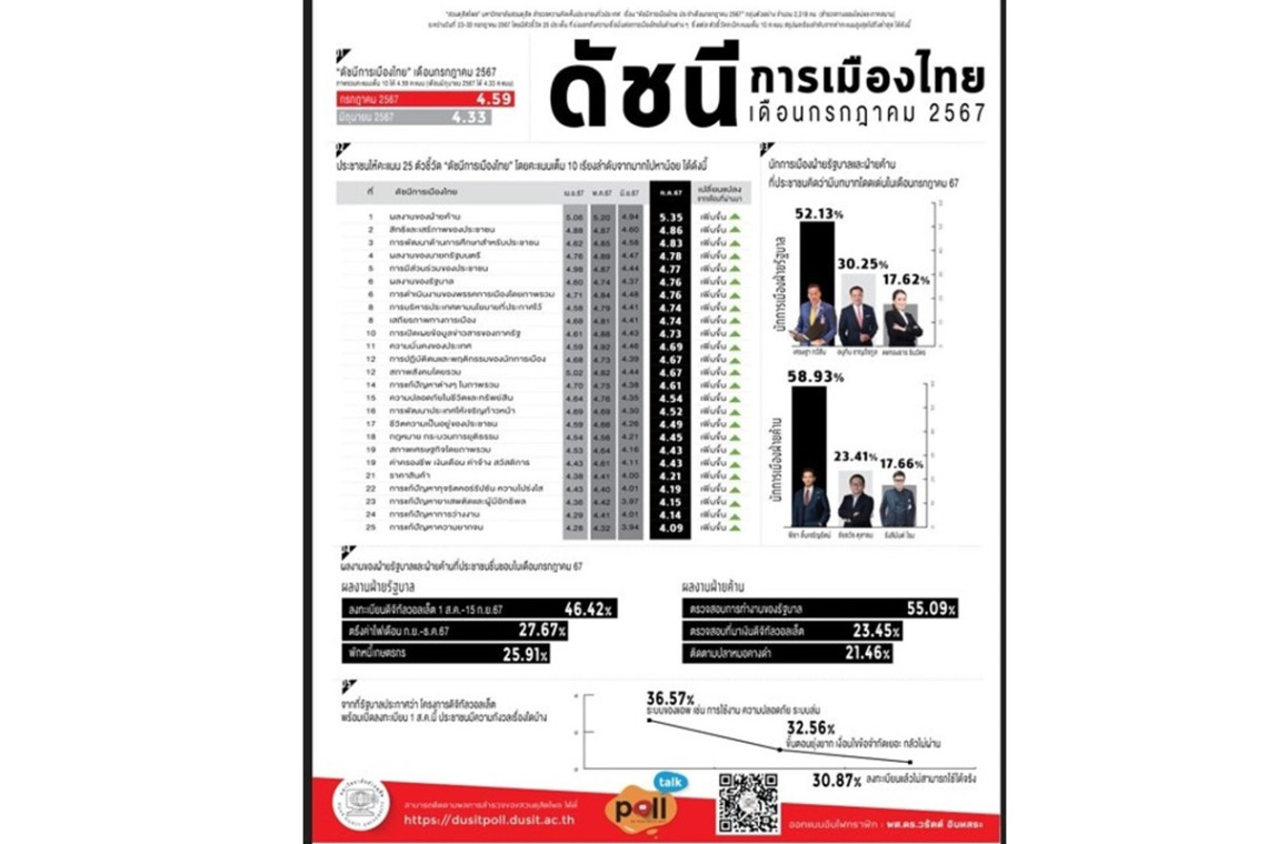 นางสาวพรพรรณ บัวทอง ประธานสวนดุสิตโพล กล่าวว่า จากผลการสำรวจคะแนนภาพรวมดัชนีการเมืองไทยในเดือนกรกฎาคมเพิ่มขึ้นเล็กน้อยจากเดือนมิถุนายน สะท้อนถึงการทำงานของรัฐบาลที่ดูดีขึ้นในสายตาประชาชน อย่างไรก็ตามการแก้ปัญหาความยากจนยังคงเป็นประเด็นที่ได้คะแนนต่ำสุด แม้จะมีคะแนนเพิ่มขึ้นจากเดือนมิถุนายน แสดงถึงความท้าทาย ที่รัฐบาลยังต้องเผชิญ ขณะที่ผลงานโดดเด่นของรัฐบาลคือความชัดเจนของนโยบายดิจิทัลวอลเล็ต ที่มีการเปิดให้ลงทะเบียน แต่ประชาชนยังกังวลเรื่องความปลอดภัยและความเสถียรของแอปพลิเคชัน รัฐบาลจึงต้องเร่งแก้ไขเพื่อสร้างความมั่นใจต่อไป ด้านฝ่ายค้านได้คะแนนสูงขึ้นจากการตามติดการทำงานของรัฐบาลอย่างใกล้ชิดโดยเฉพาะเรื่องปลาหมอคางดำที่กระทบกับชีวิตเกษตรกรเป็นวงกว้าง