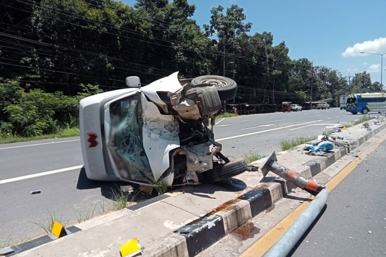 เมื่อไปถึงที่เกิดเหตุบริเวณถนนอรุณประเสริฐ ฝั่งขาเข้าอำเภอป่าติ้ว จังหวัดยโสธร พบรถกระบะตู้ทึบยี่ห้อซูซูกิสีขาว ทะเบียนศรีสะเกษ พลิกตะแคงอยู่กลางถนนในสภาพด้านหน้ารถมีร่องรอยชนกับเสาไฟฟ้าส่องสว่างจนได้รับความเสียหายและบริเวณกระบะหลังซึ่งเป็นตู้ทึบมีสินค้าที่บรรทุกมาเต็มคัน ส่วนคนขับเป็นชายอายุประมาณ 30 ปี ได้รับบาดเจ็บโดยมีอาสาฯ กู้ภัยนำตัวส่งไปที่โรงพยาบาลป่าติ้ว ก่อนหน้านั้นแล้ว ห่างออกไปเล็กน้อยพบเสาไฟฟ้าส่องสว่างที่อยู่บริเวณหัวเกาะกลางถนนถูกชนจนหักโค่น จำนวน 1 ต้น และมีป้ายบอกทางถูกชนหักไปอีก 1 ต้น