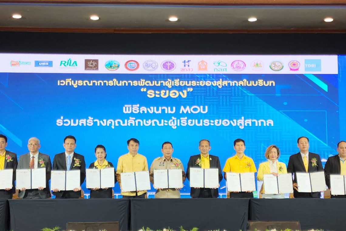 เมื่อเวลา 13.30 น. วันที่ 5 ส.ค.67 ที่โรงแรมสตาร์ คอนเวนชั่น เซ็นเตอร์ระยอง อ.เมือง จ.ระยอง ผู้สื่อข่าวรายงานว่า สถาบันการเรียนรู้ของคนทุกช่วงวัย จ.ระยอง (สถาบัน RILA) อบจ.ระยอง และสำนักงานศึกษาธิการระยอง ได้เปิดเวทีบูรณาการความร่วมมือการพัฒนาผู้เรียนสู่สากลในบริบทระยอง มีนายไตรภพ วงศ์ไตรรัตน์ ผวจ.ระยอง เป็นประธานเปิดฯ ภายในงานมีการบรรยายหัวข้อ 'การจัดการศึกษาเชิงพื้นที่ทางออกการศึกษาไทย' 'การจัดการศึกษาในบริบทระยองสู่การขับเคลื่อนเศรษฐกิจและสังคม' และ 'การเสวนาเราจะร่วมสร้างคุณลักษณะผู้เรียนระยองสู่สากลได้อย่างไร' โดยมีผู้ร่วมบรรยายพิเศษ และร่วมเวทีเสวนา ประกอบด้วย ดร.สมเกียรติ ตั้งกิจวานิชย์ ประธานสถาบันวิจัยเพื่อพัฒนาประเทศ ดร.สาธิต ปิตุเตชะ ประธานที่ปรึกษา คณะกรรมการสถาบันการเรียนรู้ของคนทุกช่วงวัยจังหวัดระยอง รศ.ประภาภัทร นิยม อธิการบดีสถาบันอาศรมศิลป์ ดร.ไกรยส ภัทราวาท ผู้จัดการกองทุนเพื่อความเสมอภาคทางการศึกษา รศ.ดร.ปัทมาวดี โพชนุกูล ผู้อำนวยการสำนักงานคณะกรรมการส่งเสริมวิทยาศาสตร์วิจัยและนวัตกรรม ดร.พิทักษ์ โสตถยาคม ผู้อำนวยการสำนักงานบริหารพื้นที่นวัตกรรมการศึกษา นายสมศักดิ์ พะเนียงทอง ผู้อำนวยการสถาบันการเรียนรู้ของคนทุกช่วงวัยจังหวัดระยอง และนายปรัชญา สมะลาภา รองประธานกรรมการหอการค้าไทย นอกจากนี้ภายในงานยังได้มีการลงนาม MOU บันทึกความร่วมมือของหน่วยงาน รวม 16 แห่ง ในการพัฒนาผู้เรียนระยองสู่สากลอีกด้วย ทั้งนี้มีเป้าการผลิตและพัฒนากำลังคนในการพัฒนาเศรษฐกิจและสังคม เพื่อรวมสร้างระยองให้เป็นเมืองน่าอยู่ตามยุทธศาสตร์และแผนพัฒนาการศึกษา จ.ระยอง พ.ศ. 2566-2567