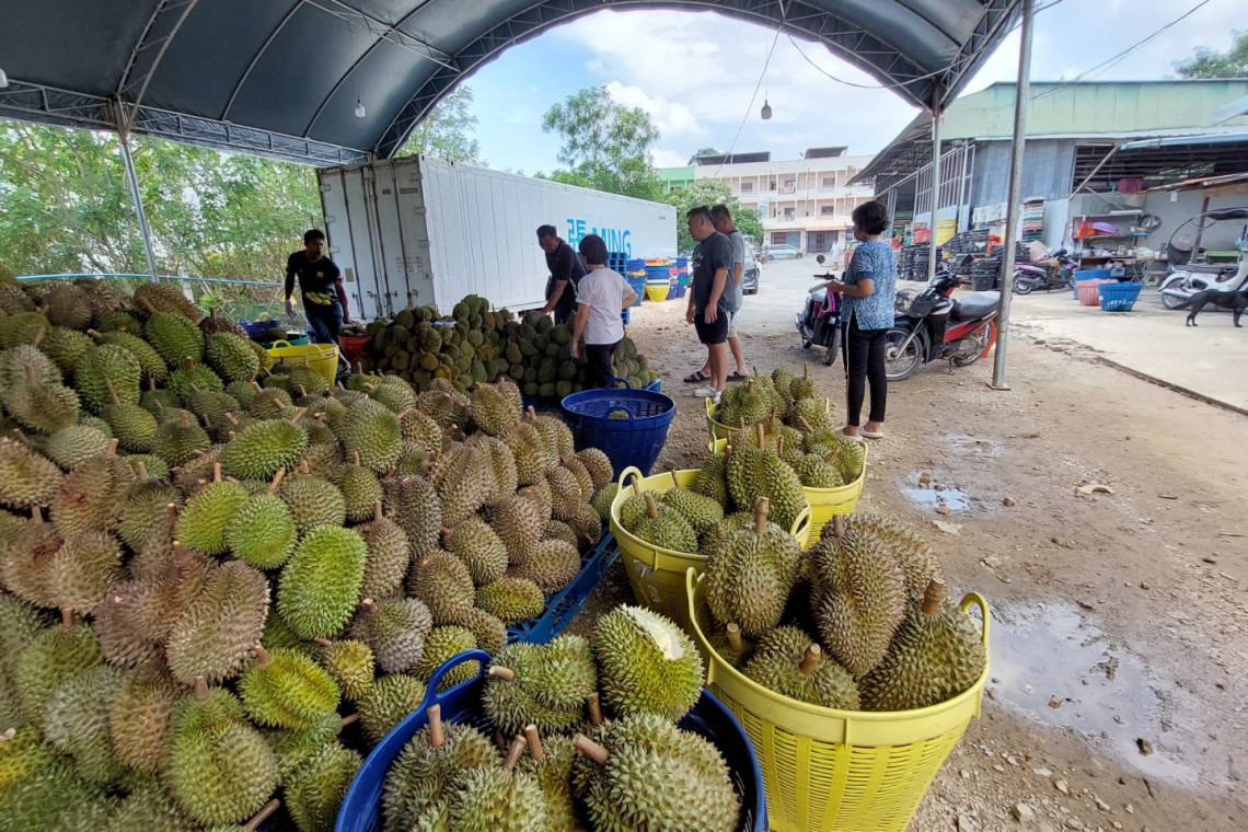 จากการที่ผลผลิตทุเรียนในปีนี้ค่อนข้างน้อย ปัจจัยสำคัญมาจากสภาพอากาศที่เปลี่ยนแปลงในช่วงที่ผ่านมา ทำให้ดอกทุเรียนที่ออกเป็นจำนวนมากร่วง ส่งผลให้ปีนี้ทุเรียนออกล่าช้ากว่าปีอื่น ๆ คาดว่าผลผลิตจะเข้าสู่ตลาดไม่มากนัก แต่ในช่วงเดือนกรกฎาคม – สิงหาคม ทุเรียนจะเริ่มทยอยเข้ามาในตลาดเพิ่มมากขึ้น ส่วนที่ทุเรียนที่รับมาในขณะนี้เป็นของเกษตรกรในพื้นที่อ.เบตง จ.ยะลา เพื่อส่งออกจะมีอยู่ 2 พันธุ์ คือ พันธุ์พวงมณีและพันธุ์ชะนี ซึ่งราคาขายทุเรียนในช่วงนี้ ทุเรียนพันธุ์พวงมณี มี 3 เกรด คือ เกรดเบอร์ 1 ราคาขายส่ง กิโลกรัมละ 120-125 บาท นำมาขายส่งออก กิโลกรัมละ 130-140 บาท เกรดเบอร์ 2 ราคาขายส่ง กิโลกรัมละ 75-80 บาท ขายส่งออก กิโลกรัมละ 80-85 บาท และเกรดเบอร์ 3 ราคาขายส่ง กิโลกรัมละ 40-50 บาท ขายส่งออก กิโลกรัมละ 45-60 บาท ส่วนทุเรียนพันธุ์ชะนี มี 2 เกรด คือ เกรด A รับมา กิโลกรัมละ 60-65 ขายส่ง กิโลกรัมละ 60-70 บาท เกรด B ราคารับมา กิโลกรัมละ 40-60 บาท ขายส่ง กิโลกรัมละ 45-65 บาท