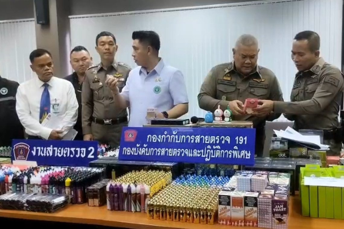 พลตำรวจโทนิรันดร เหลื่อมศรี ผู้ช่วยผู้บัญชาการตำรวจแห่งชาติ และนายกองตรี ดร.ธนกฤต จิตรอารีย์รัตน์ ผู้ช่วยรัฐมนตรีประจำกระทรวงสาธารณสุข ร่วมแถลงผลการจับกุมผู้ลักลอบจำหน่ายบุหรี่ไฟฟ้าช่องทางออนไลน์ โดยกล่าวว่า เจ้าหน้าที่ตำรวจชุดจับกุมได้ รับข้อมูลจากสายลับว่ามีการจำหน่ายบุหรี่ไฟฟ้าผ่านทางแอปพลิเคชั่นไลน์ชื่อบัญชีว่า “33VAPE” จึงใช้ระยะเวลากว่า 1 เดือนสืบสวนจนทราบว่า กลุ่มผู้ต้องหาได้ใช้บ้านเลขที่ 1390/91 ซ.ชานเมือง 10 แขวงดินแดง เขตดินแดง กรุงเทพมหานคร เปิดเป็นสถานที่ซุกซ่อน และลักลอบจำหน่ายบุหรี่ไฟฟ้า, น้ำยาบุหรี่ไฟฟ้า และอุปกรณ์ส่วนควบ จำหน่ายให้กับลูกค้าผ่านช่องทางออนไลน์และกระจายให้กับผู้ค้ารายย่อยในพื้นที่กรุงเทพมหานคร จึงได้เฝ้าติดตามจนพบนายภควัตหรือเมฆ อายุ 23 ปี นำกระสอบสีรุ้งใบใหญ่มาส่งมอบให้กับรถจักรยานยนต์รับจ้างที่มาจอดบริเวณหน้าบ้าน เจ้าหน้าที่ได้แสดงตัวเข้าจับกุมพร้อมตรวจค้นภายในบ้าน พบของกลางเป็นพัสดุและอุปกรณ์เกี่ยวกับบุหรี่ไฟฟ้าจำนวนมาก แบ่งเป็นหัวน้ำยาบุหรี่ไฟฟ้า 11,261 หัว, น้ำยาบุหรี่ไฟฟ้า 5611 ขวด, บุหรี่ไฟฟ้าแบบสูบแล้วทิ้ง 2750 ชิ้น, เครื่องบุหรี่ไฟฟ้า 454 เครื่อง, คอยด์ 4431 ชิ้นและเครื่องชาร์จจำนวน 37 เครื่อง รวม 24,544 ชิ้น มูลค่ารวมประมาณ 5 ล้านบาท และยังพบนางสาวภัคจิราหรือกิ้ฟอายุ 41 ปี ภายในบ้านพักด้วย จึงได้นำผู้ต้องหาพร้อมของกลางส่งพนักงานสอบสวนสถานีตำรวจนครบาลห้วยขวางเพื่อดำเนินคดี ในความผิดตามมาตรา 246 พระราชบัญญัติศุลกากร พ.ศ.2560 ต่อไป