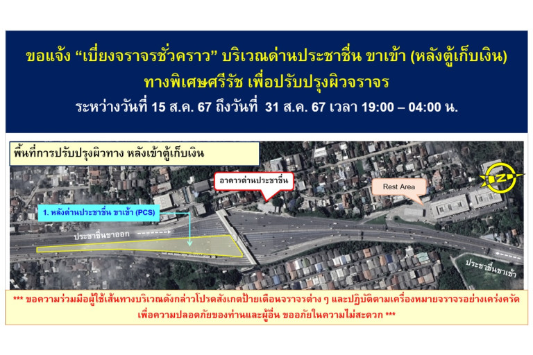 บริษัท ทางด่วนและรถไฟฟ้ากรุงเทพ จำกัด (มหาชน) หรือ BEM คำนึงถึงความปลอดภัยในการเดินทางของประชาชน จึงขอประชาสัมพันธ์แจ้งเบี่ยงการจราจรชั่วคราวทางพิเศษศรีรัช บริเวณหลังด่าน ประชาชื่น ขาเข้า (หลังตู้เก็บเงิน) เพื่อปรับปรุงผิวจราจร