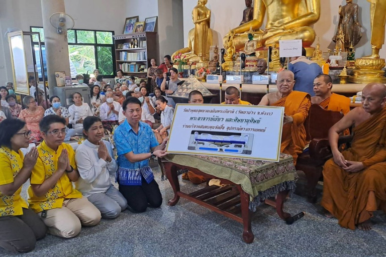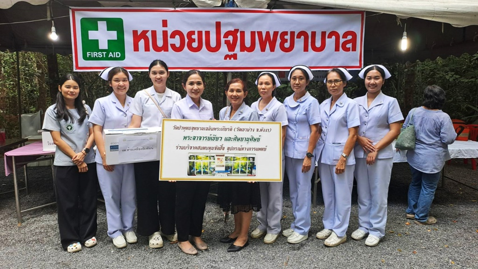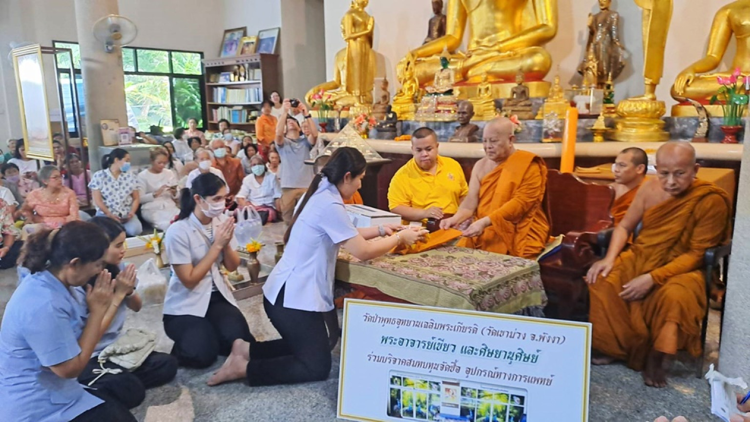 ในส่วนของการส่งมอบอุปกรณ์ทางการแพทย์นั้น ได้รับความเมตตาจากพระเทพมงคลโสภณ เจ้าคณะภาค17-18 (ธรรมยุต)มาเป็นประธานมอบ และมีนายแพทย์วิเศษ กำลัง รองนายแพทย์สาธารณสุขจังหวัดพังงา พร้อมด้วยนายแพทย์วีระศักดิ์ หล่อทองคำ ผอ.โรงพยาบาลวชิระภูเก็ต นำคณะผู้บริหารโรงพยาบาลในพื้นที่จังหวัดพังงา-ภูเก็ตและพัทลุงเข้ารับมอบ ประกอบด้วย เตียงผู้ป่วยไฟฟ้า 3 ไกร์ พร้อมตู้ข้างเตียงและโต๊ะคร่อมเตียง มอบให้ โรงพยาบาลวชิระภูเก็ต 68 ชุด