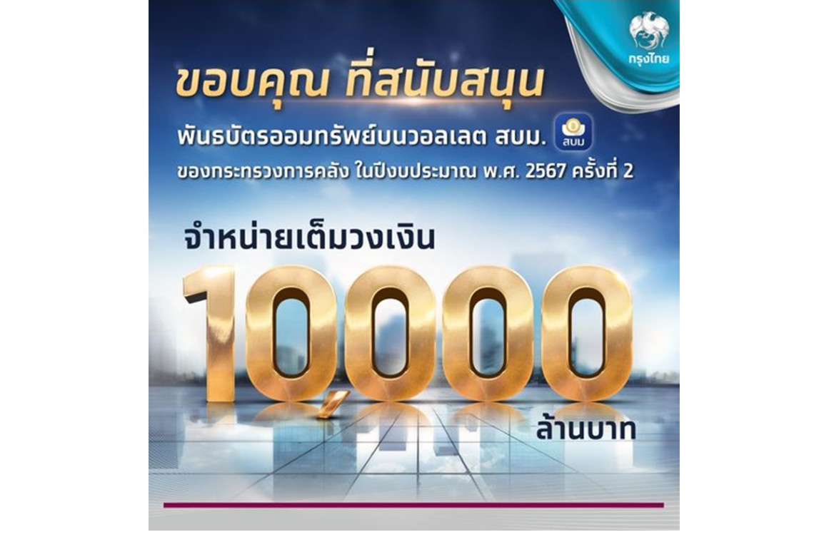 ล่าสุด ธนาคารกรุงไทย แจ้งว่า ขอขอบคุณที่สนับสนุน “พันธบัตรออมทรัพย์บน วอลเล็ต สบม.” ของกระทรวงการคลัง ในปีงบประมาณ พ.ศ.2567 ครั้งที่ 2 ผ่านแอปฯ “เป๋าตัง” ประชาชนจองซื้อเต็มวงเงิน 10,000 ล้านบาท ตอกย้ำความสำเร็จในการเปิดโอกาสให้ประชาชนทุกกลุ่มเข้าถึงการลงทุนอย่างทั่วถึงและเท่าเทียม
