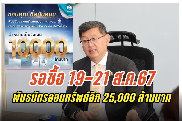 คลังขอขอบคุณประชาชนที่ให้การตอบรับพันธบัตรออมทรัพย์บนวอลเล็ต สบม. วงเงิน 10,000 ล้านบาท เป็นอย่างมาก พบกันอีกครั้ง 19 - 21 สิงหาคม 2567 อีก 25,000 ล้านบาท ผ่าน 6 ธนาคารตัวแทนจำหน่าย
