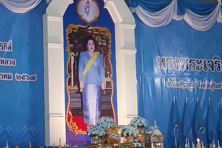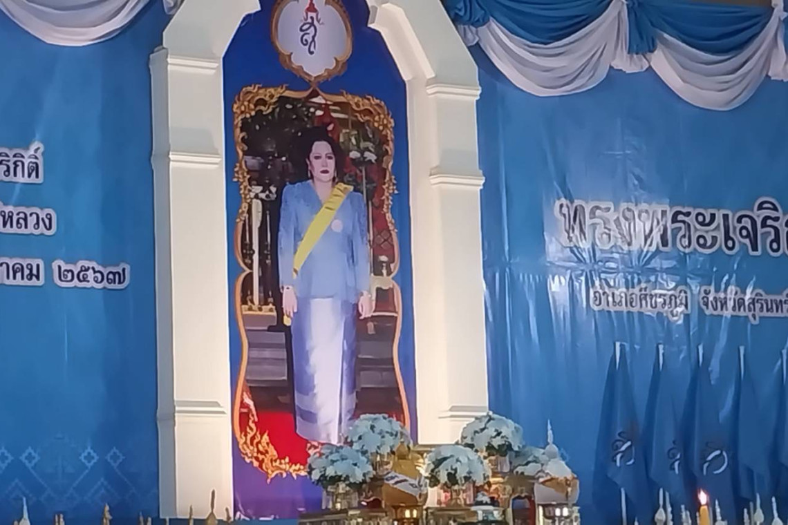 สุรินทร์ พสกนิกรชาว อำเภอศีขรภูมิจัดพิธีถวายเครื่องสักการะและวางพานพุ่มพิธีจุดธูปเทียนถวายพระพรชัยมงคลสมเด็จพระนางเจ้าสิริกิติ์พระบรมราชินีนาถพระบรมราชชนนีพันปีหลวงเนื่องในโอกาสวันเฉลิมพระชนมพรรษา12สิงหาคม2567ท่ามกลางสายฝนที่โปรยลงมาอย่างต่อเนื่อง