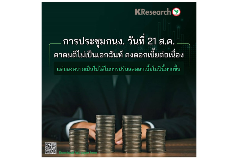 "ศูนย์วิจัยกสิกรไทย" ชี้ประชุม กนง.21 ส.ค.นี้คาดมติไม่เป็นเอกฉันท์ คงดอกเบี้ยต่อเนื่อง