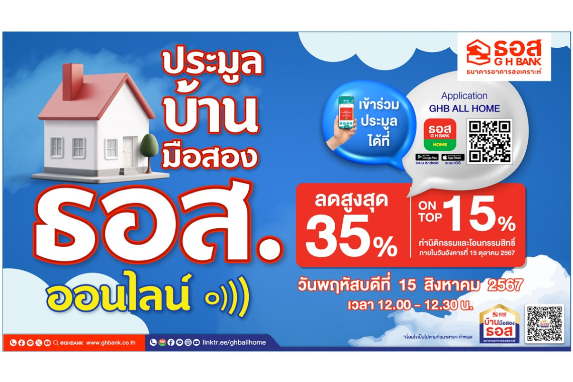 ธนาคารอาคารสงเคราะห์ เอาใจคนอยากมีบ้าน นำทรัพย์เด่น ทำเลดีมากกว่า 1,800 รายการทั่วประเทศ มาจำหน่ายในราคาพิเศษลดสูงสุด 35% จากราคาประเมิน ในงาน “ประมูลบ้านมือสองออนไลน์ : GHB’s NPA Online Auction 2024” ผ่าน Application : GHB ALL HOME วันพฤหัสบดีที่ 15 สิงหาคม 2567 สำหรับผู้ชนะการประมูลที่ทำนิติกรรมและโอนกรรมสิทธิ์ภายในวันอังคารที่ 15 ตุลาคม 2567 พิเศษ!! รับส่วนลด On Top เพิ่มอีก 15% จากราคาที่ปิดประมูล