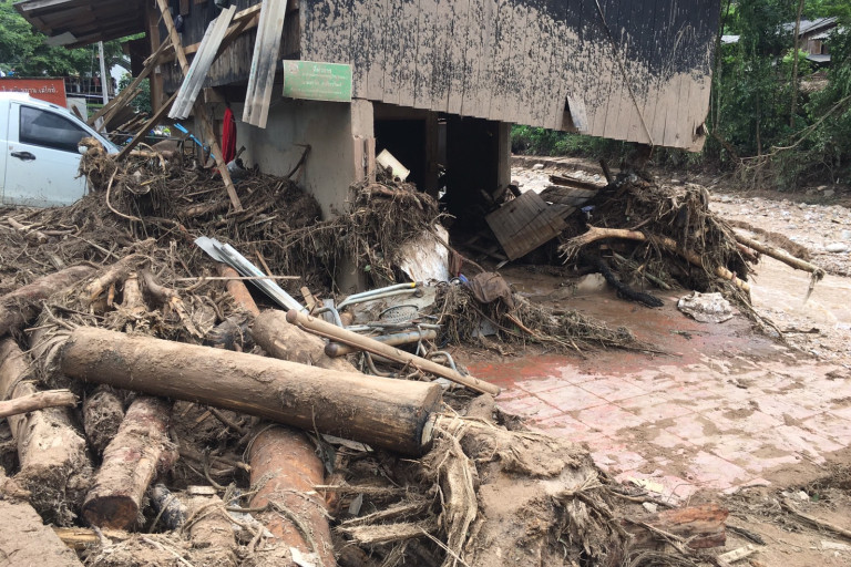 ซึ่งทางคณะเจ้าหน้าที่ ต้องเดินเท้าเข้าสู่ที่หมาย พร้อมลำเลียงเครื่องอุปโภค บริโภค นำไปช่วยบรรเทาความเดือดร้อนให้กับประชาชนที่บ้านเรือนถูกน้ำป่าพัดได้รับความเสียหายบางส่วนก่อนเพื่อบรรเทาความเดือดร้อน ซึ่งบ้านแม่โกปี่มีชาวบ้าน 144 ครัวเรือน 408 คน มีบ้านเรือนเสียหาย 8 หลัง ส่วน หย่อมบ้านหัวแม่ลาก๊ะใต้ ม.8 ตำบลแม่ยวมน้อย มี 23 ครัวเรือน 120 คน / บ้านเรือนเสียหาย 5 หลัง มีผู้เสียชีวิต 1 คน และบาดเจ็บจากการข้ามน้ำ มีแผลถลอกที่ขา 1 คน