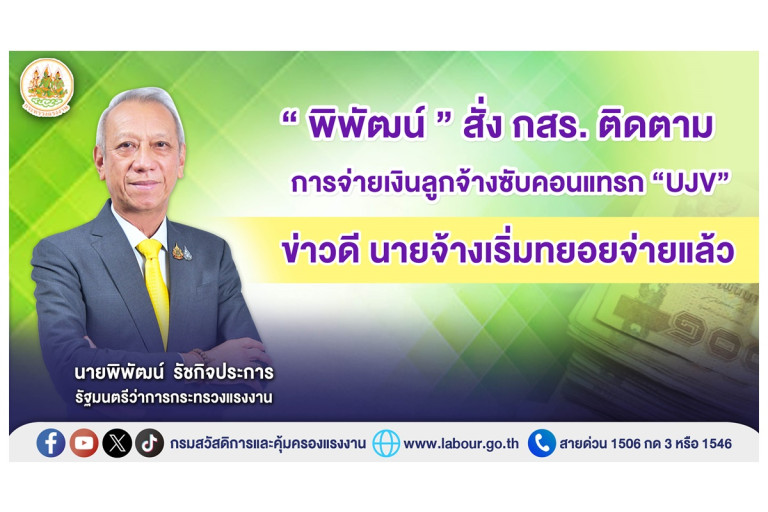 รมว.แรงงาน มอบหมายให้อธิบดีกรมสวัสดิการและคุ้มครองแรงงาน ลงพื้นที่ชลบุรีเมื่อวันที่ 13 สิงหาคม 2567 ติดตามการจ่ายค่าจ้างลูกจ้างบริษัท Subcontract ของกิจการร่วมค้า UJV พร้อมเผยข่าวดีทยอยจ่ายเงินลูกจ้างทุกคนให้ครบถ้วน