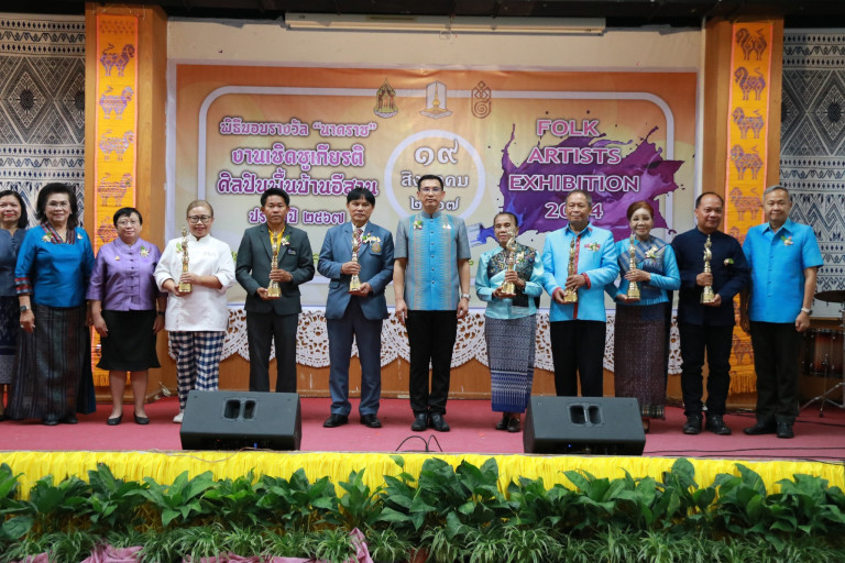 เมื่อวันที่ 19 ส.ค.67 สถาบันวิจัยศิลปะและวัฒนธรรมอีสาน มหาวิทยาลัยมหาสารคาม จัดโครงการเชิดชูเกียรติศิลปินพื้นบ้านอีสาน ประจำปี 2567 และโครงการเครือข่ายศิลปินพื้นบ้านอีสาน ประจำปี 2567 โดยมี ผู้ช่วยศาสตราจารย์ ดร.กนกพร รัตนสุธีระกุล รองอธิการบดีฝ่ายการคลังและพัสดุ กล่าวต้อนรับผู้เข้าร่วมงาน และได้รับเกียรติจาก นายวิบูรณ์ แววบัณฑิต ผู้ว่าราชการจังหวัดมหาสารคาม เป็นประธานในพิธีเปิดงาน พร้อมมอบรางวัล “นาคราช” เพื่อเชิดชูเกียรติศิลปินพื้นบ้านอีสาน ประจำปี 2567 จำนวน 7 คน โดยผู้ที่ได้รับรางวัลในสาขาต่าง ๆ ได้แก่