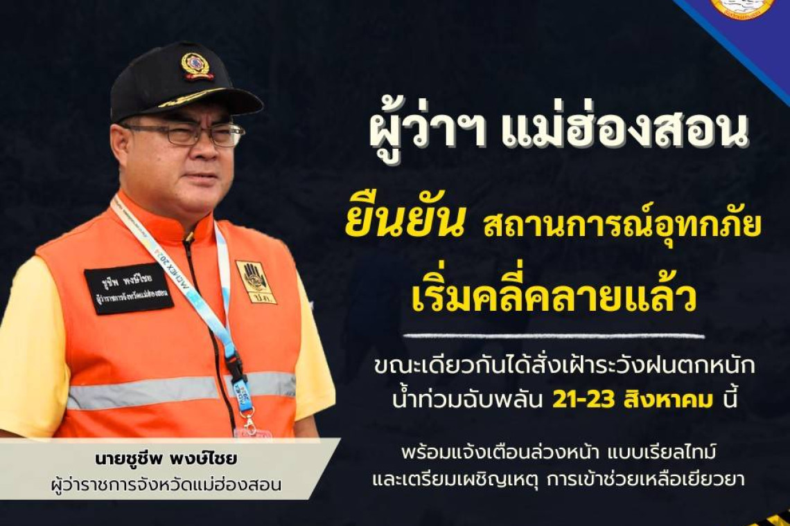 ผู้ว่าราชการจังหวัดแม่ฮ่องสอน ยืนยันสถานการณ์อุทกภัยในพื้นที่จังหวัดเริ่มคลี่คลาย ขณะเดียวกันได้สั่งเฝ้าระวังฝนตกหนัก น้ำท่วมฉับพลัน 21-23 สิงหาคม นี้ พร้อมแจ้งเตือนล่วงหน้า แบบเรียลไทม์ และเตรียมเผชิญเหตุ การเข้าช่วยเหลือเยียวยา