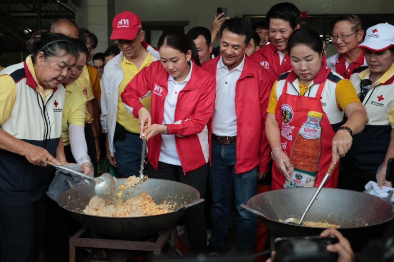 หัวหน้าพรรคเพื่อไทย ลงพื้นที่จังหวัดน่าน ให้กำลังใจประชาชนที่ประสบกับน้ำท่วม ร่วมทอดไข่ ผัดเส้น ข้าวผัด ร่วมกับคณะ ขณะที่อาสาสมัคร ต่างดีใจ และขอถ่ายภาพ