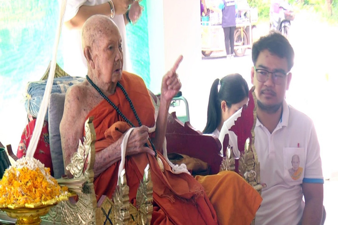 หลวงปู่คีบ ธีรปัญโญ เกจิดังเทพเจ้าลุ่มน้ำโขง อายุ 109 ปี ทำพิธีปลุกเสกวัตถุมงคล 4 รุ่น เช่น รุ่นสารพัดนึก,รุ่นเจริญพรกลาง,รุ่นบารมีร้อยแปด,และรุ่นปิดตารวยเหนือดวง บารมีสูงใช้นิ้วมือลงยันต์อักขระ ชาวบ้านรับแจกเหรียญ พร้อมแห่ส่องขันน้ำมนต์