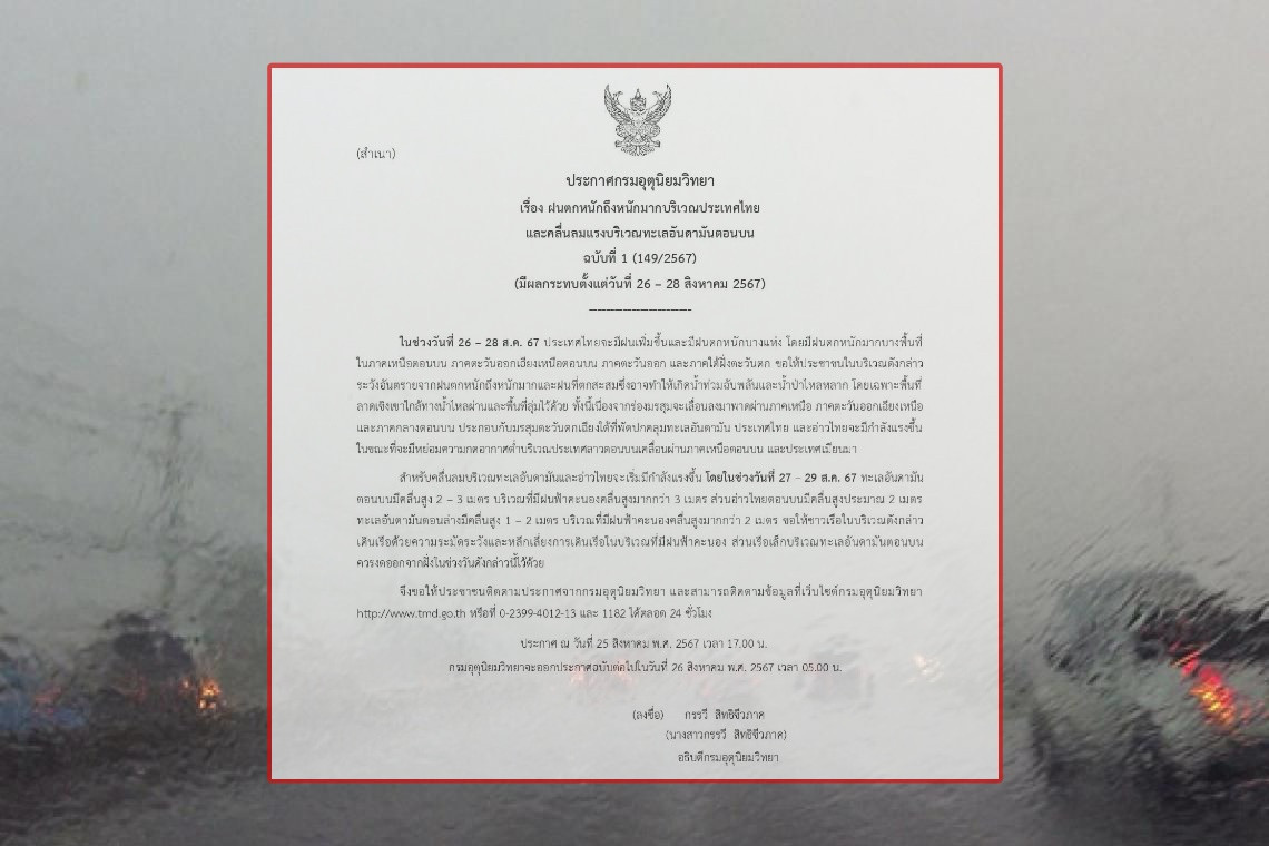 เมื่อวันที่ 25 ส.ค.67 กรมอุตุนิยมวิทยา ประกาศ เรื่อง ฝนตกหนักถึงหนักมากบริเวณประเทศไทย และคลื่นลมแรงบริเวณทะเลอันดามันตอนบนฉบับที่ 1 (149/2567)